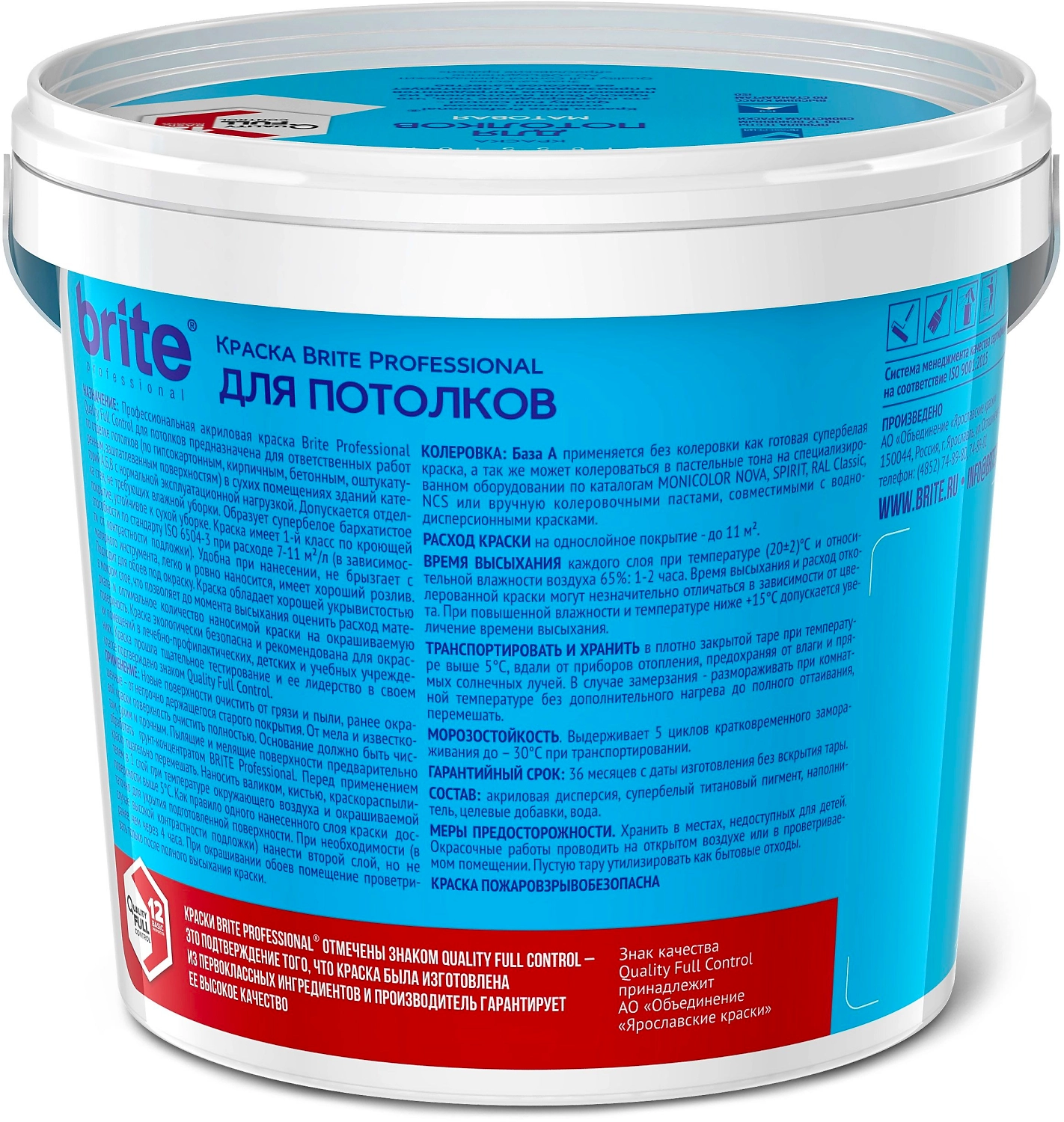 Профессиональная акриловая краска Brite Professional Quality Full Control для потолков матовая. Образует супербелое бархатистое покрытие, устойчивое к сухой уборке.