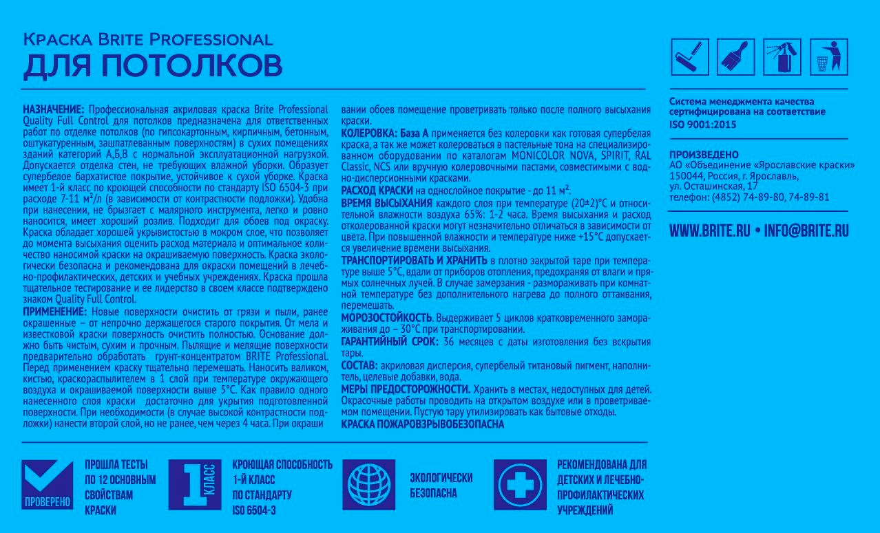 Профессиональная акриловая краска Brite Professional Quality Full Control для потолков матовая. Образует супербелое бархатистое покрытие, устойчивое к сухой уборке. Удобна при нанесении на горизонтальные поверхности , не брызгает с малярного инструмента, легко и ровно наносится.