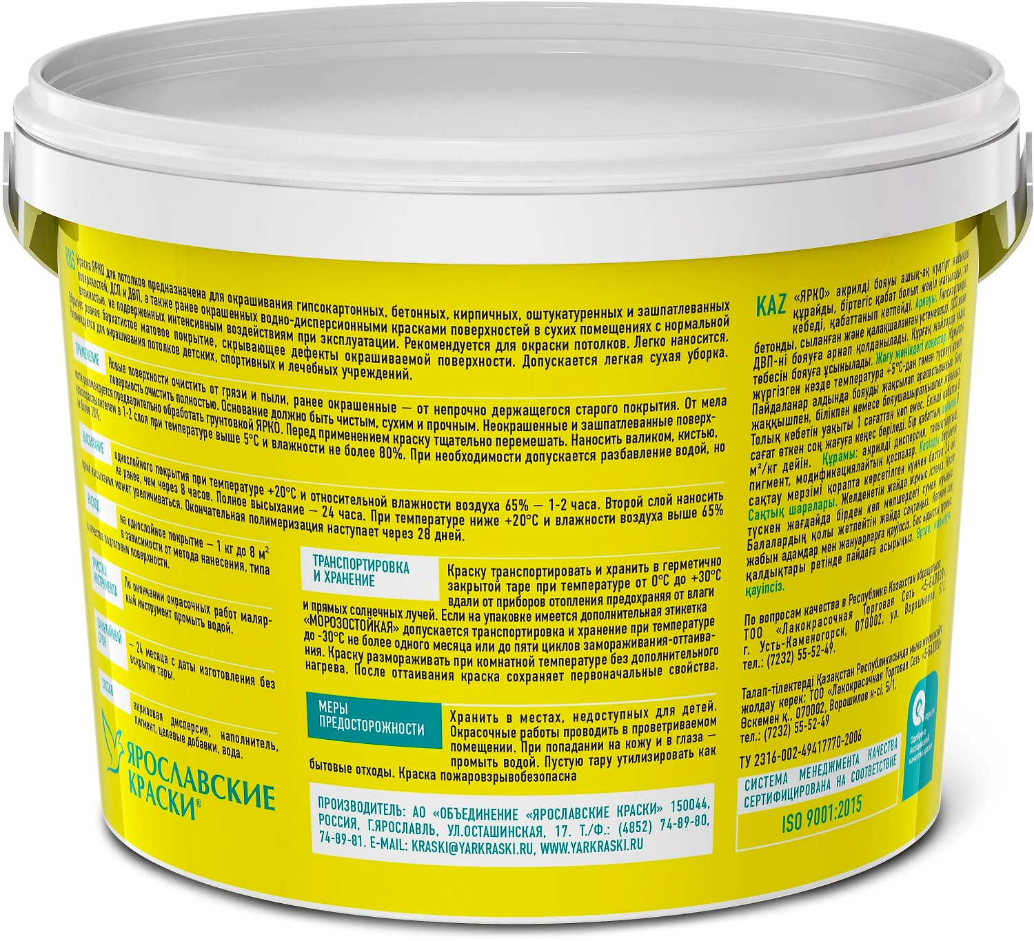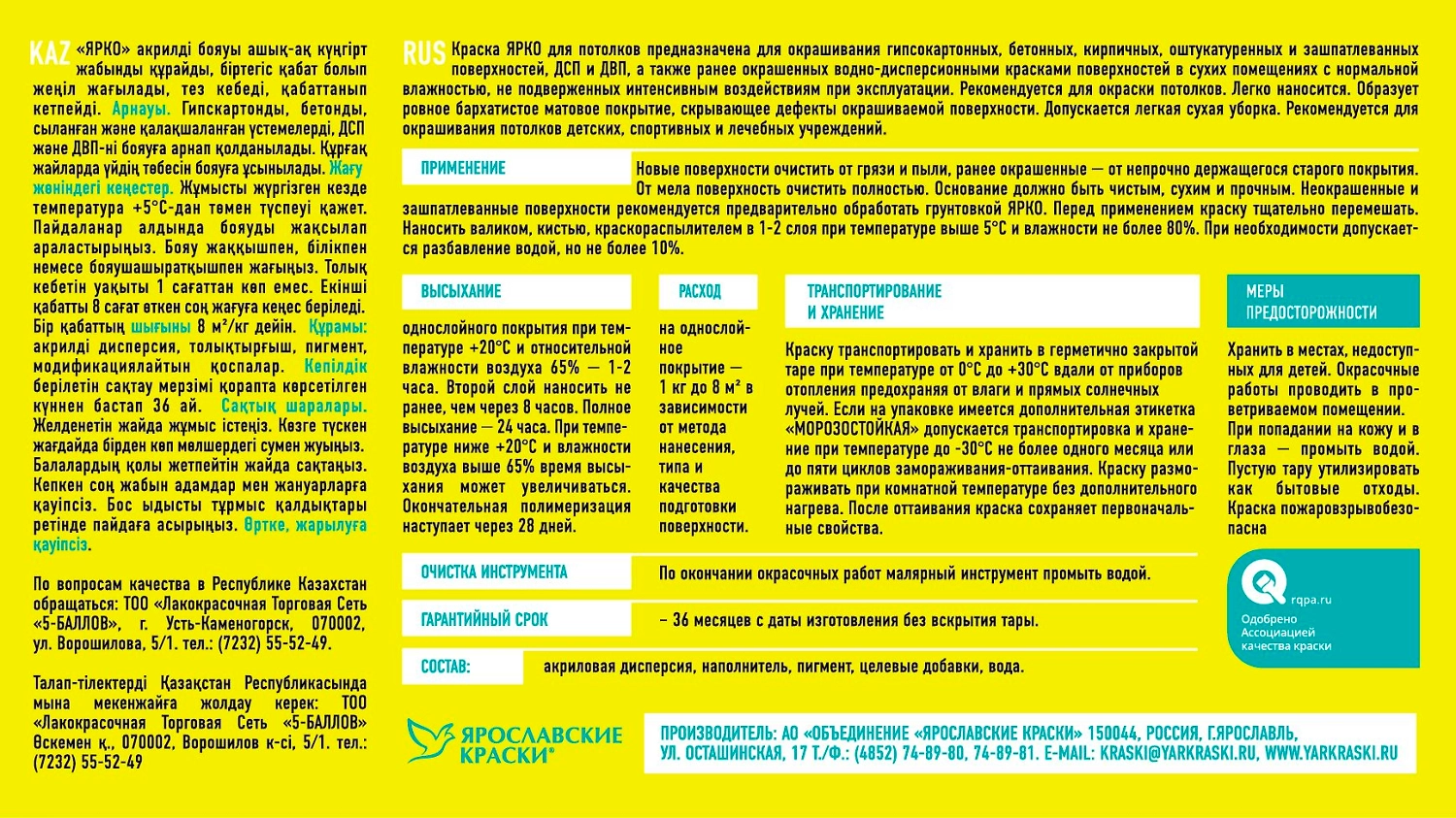 Супербелая акриловая краска ЯРКО предназначена для окраски потолков, а так же гипсокартонных, бетонных, оштукатуренных и зашпатлеванных поверхностей, ДСП и ДВП в сухих помещениях с нормальной