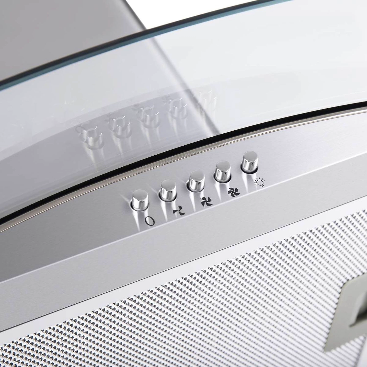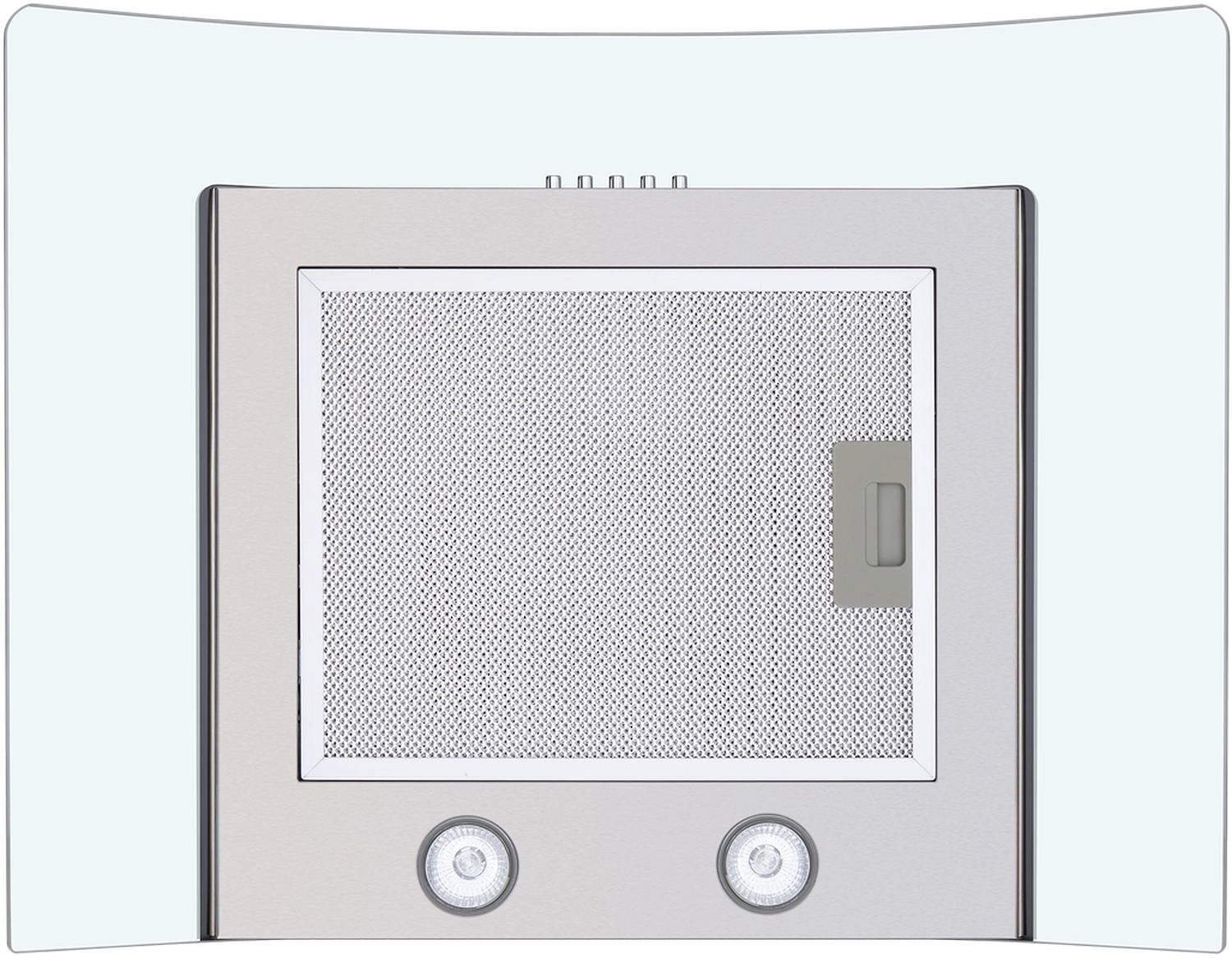 Оригинальная Т-образная вытяжка шириной 50 см со стеклянной арочной накладной панелью. Эргономичное кнопочное управление.