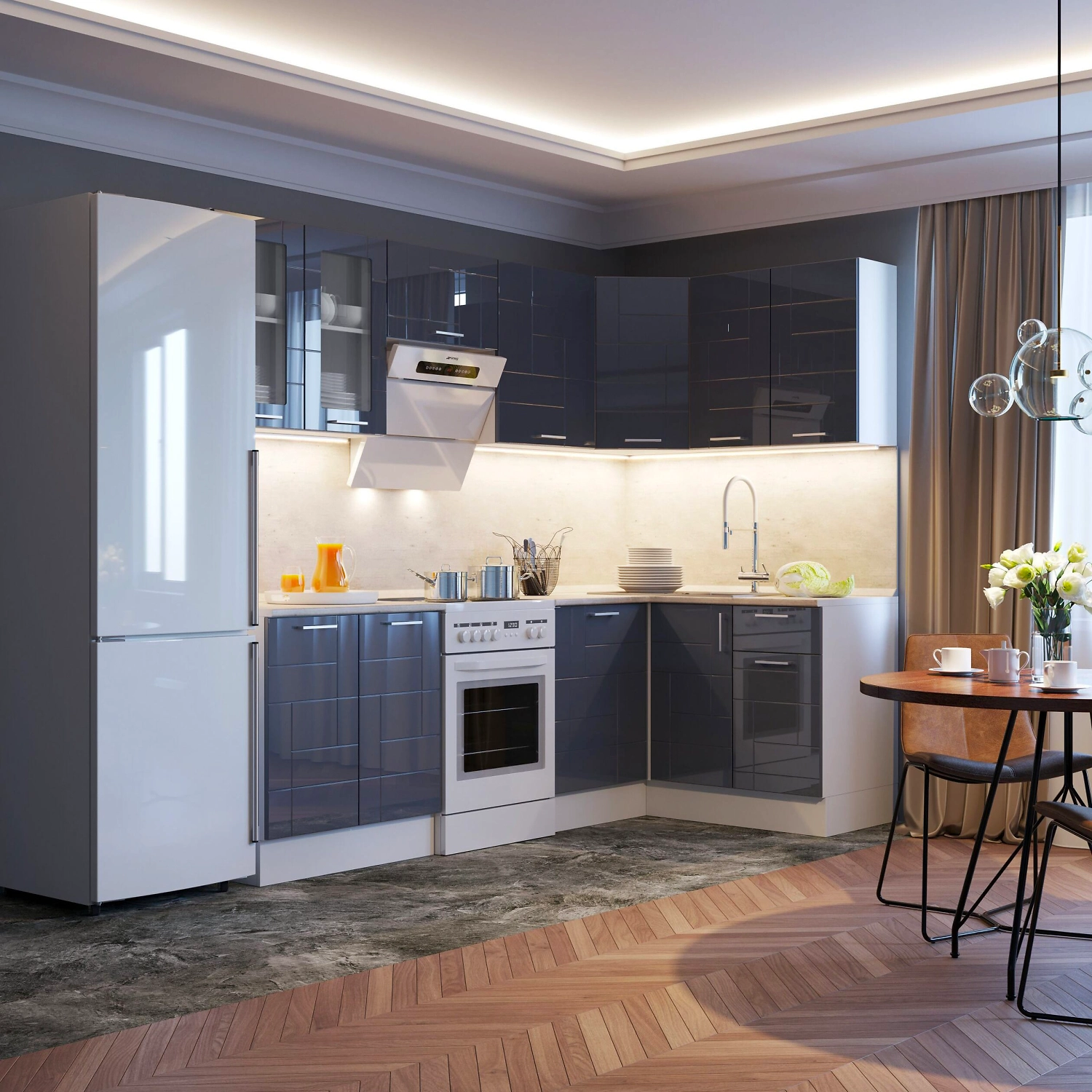 Неаполь - линейка кухонной мебели с модным сочетанием глянцевых темных фасадов и светлого корпуса. Фасады шкафов декорированы асимметричной фрезеровкой, дополнены удобными хромированными ручками-скобами.
