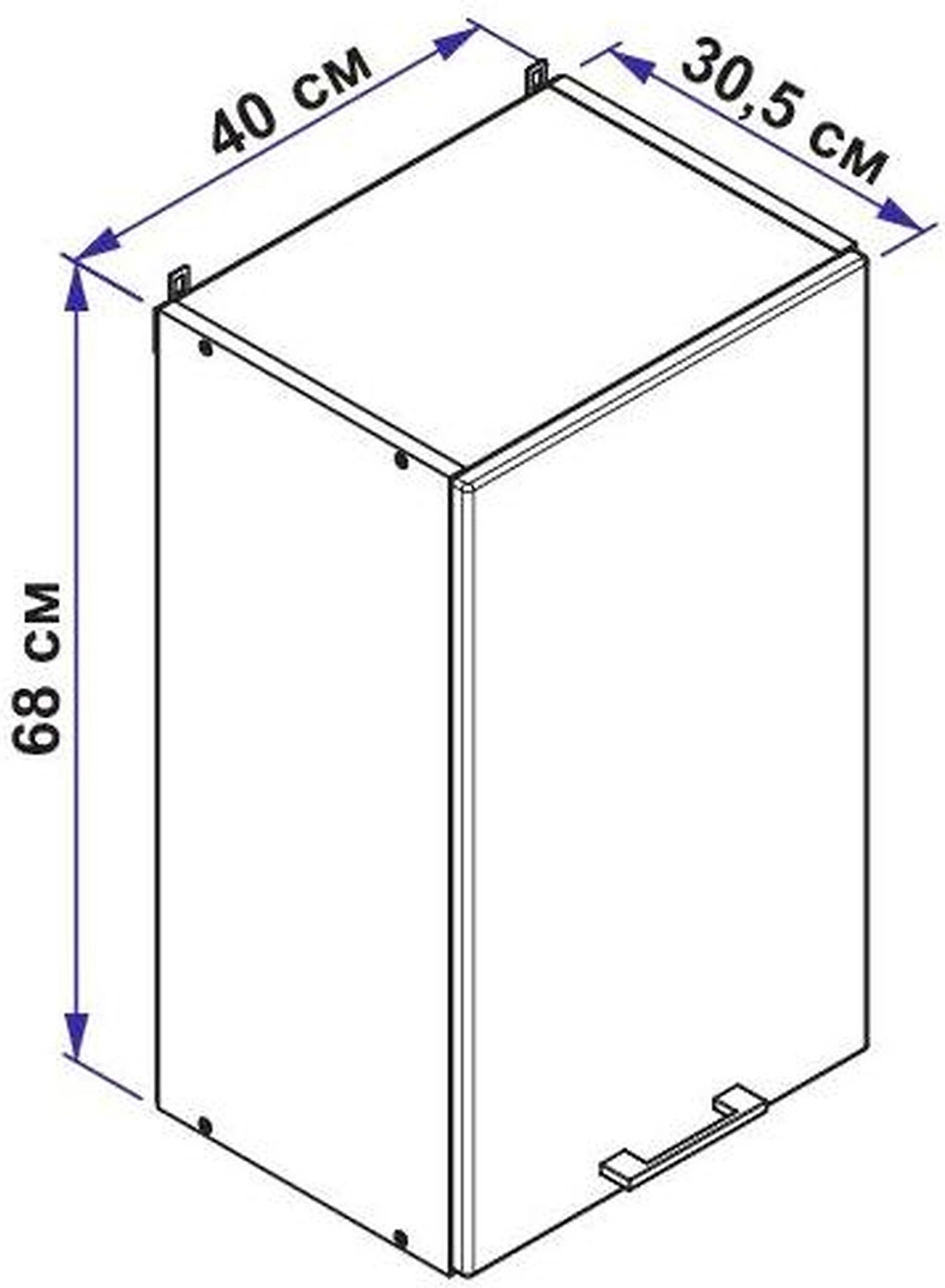 Настенный шкаф Дублин шириной 40 см - компактный подвесной модуль с глухой распашной дверцей и полкой, который удобно использовать для хранения посуды и кухонных принадлежностей.