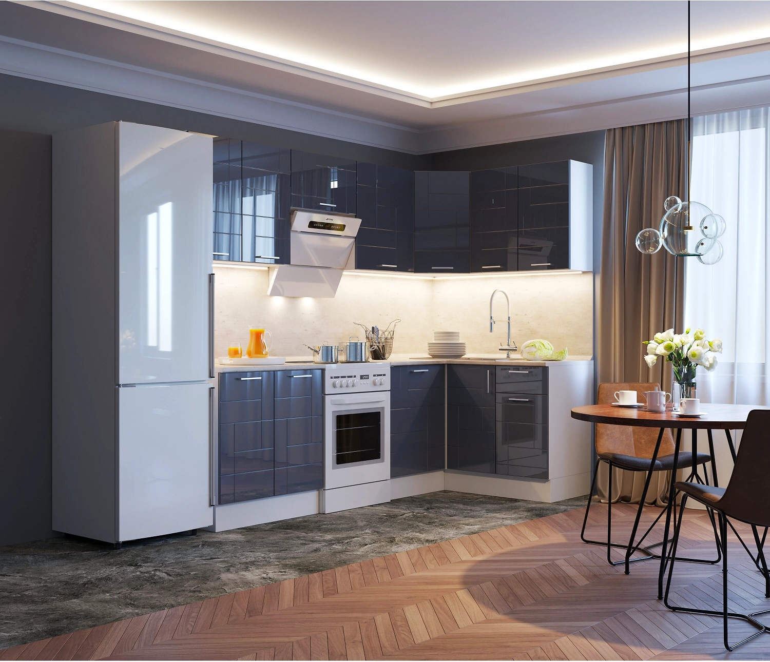 Серия кухонной мебели Неаполь выполнена в ультрамодном современном стиле. Светлые каркасы шкафов эффектно контрастируют с темными глянцевыми фасадами, декорированными асимметричной фрезеровкой и металлическими ручками-скобами.