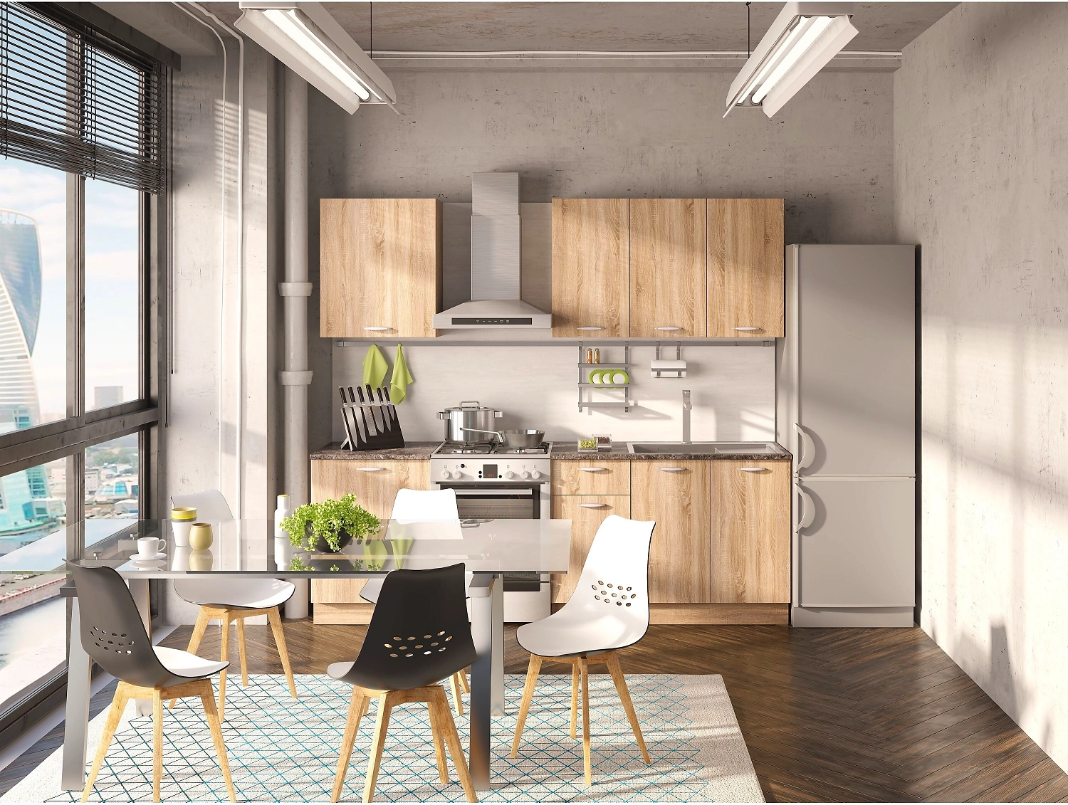 Серия мебели для кухни Сафари выполнена в лаконичном современном стиле. Гладкие фасады цвета светлого дерева оснащены миниатюрными ручками закругленной формы. Напольные модули дополнены темно-коричневой столешницей с имитацией натурального камня.