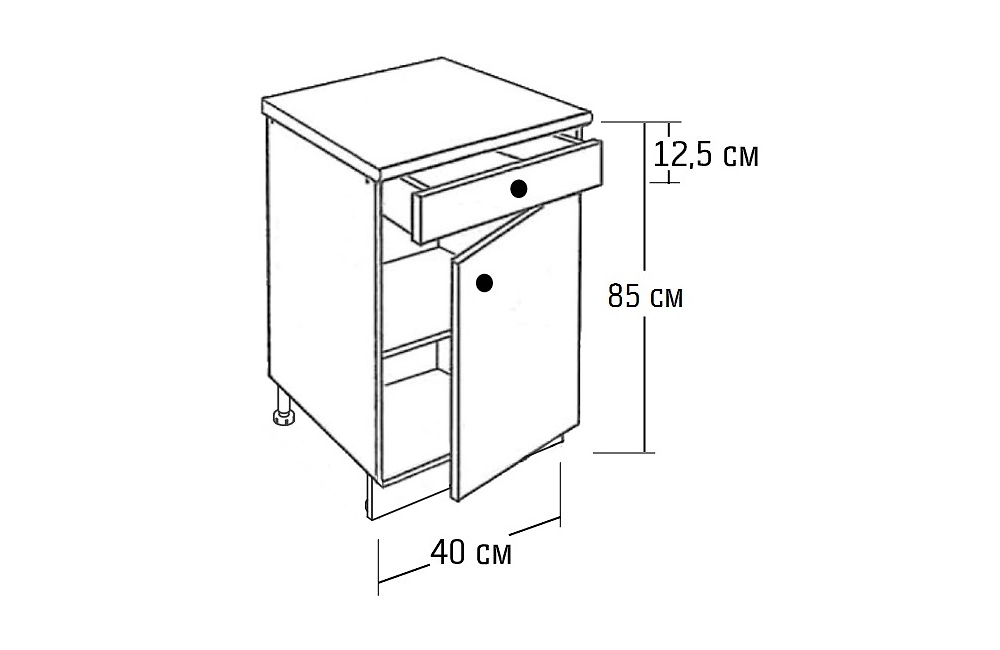 Шкаф напольный коллекции "Виола" с одной полкой, дверцей и выдвижным ящиком - удобный, функциональный с отличной вместительностью. Может использоваться для хранения кухонной посуды, продуктов, кухонной техники или аксессуаров. В комплект входит декорированная столешница, закромленная с обеих сторон.