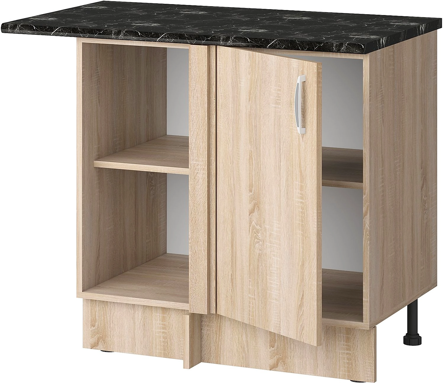 Угловой напольный шкаф Сафари актуален для кухни г-образной планировки. За стандартным фасадом находится вместительное внутреннее пространство. В шкафу с глухой дверцей и полкой можно разместить бытовую технику, посуду, а также бакалейные товары, для хранения которых требуется защищенное от света место. Большая столешница с имитацией натурального темно-коричневого камня увеличивает площадь рабочей зоны на кухне.