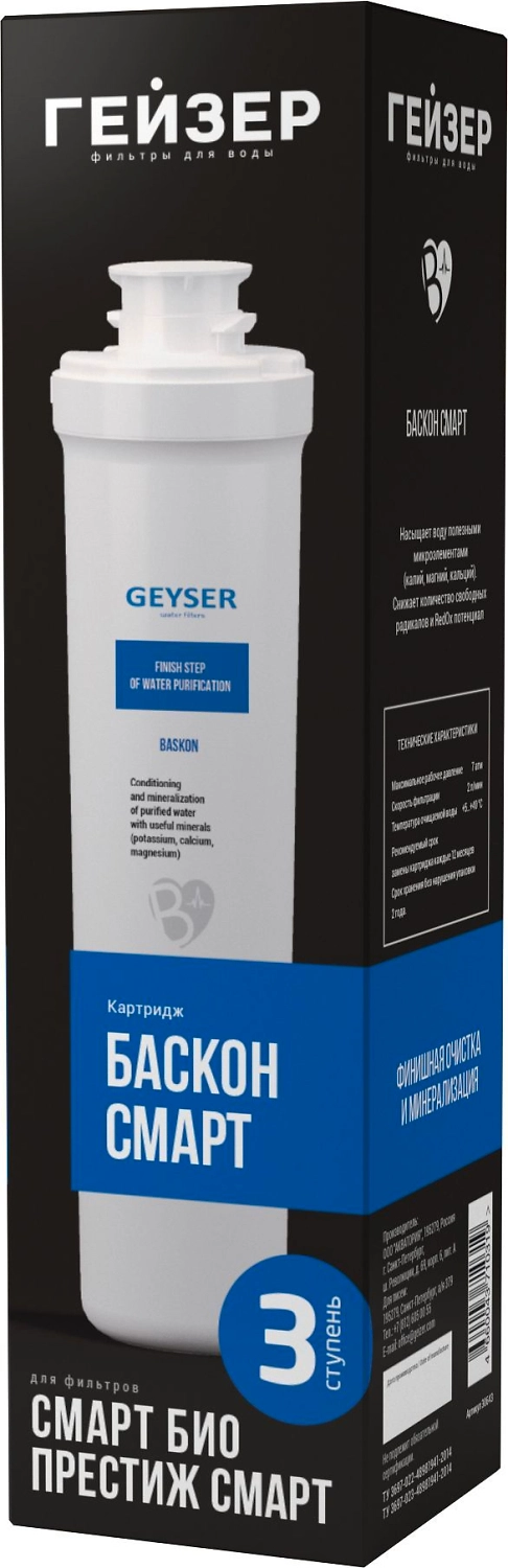 Сменный картридж для осмос Гейзер Престиж Смарт. 3 ступень. Картридж финишной очистки и минерализаци с технологией Баскон. Разработанная компанией Гейзер технология минерализации Баскон позволяет получить чистую и полезную воду насыщенную минералами (калий, магний, кальций).