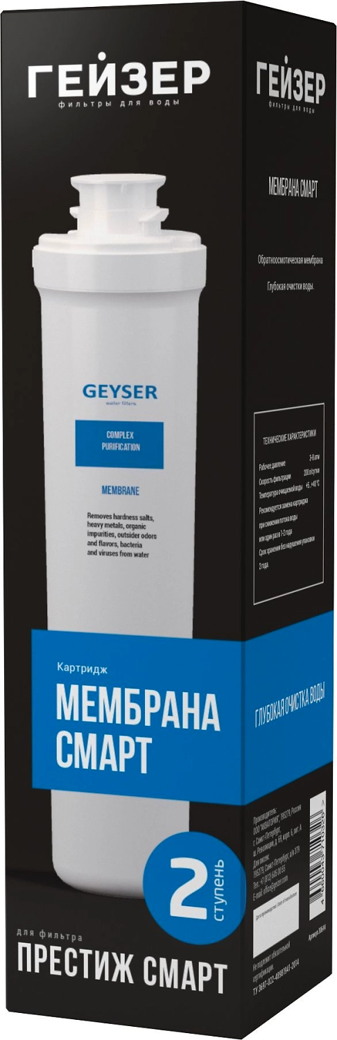 Сменный картридж для осмос Гейзер Престиж Смарт. 2 ступень, картридж с обратноосмотической мембраной. Размер пор 0,0001 мкм гарантированно очищает воду от всех примесей (тяжелые металлы, растворенное железо, хлор, соли жесткости, нитраты, сульфаты, а так же бактерии и вирусы). Все отфильтрованные примеси будут сброшены в дренаж.