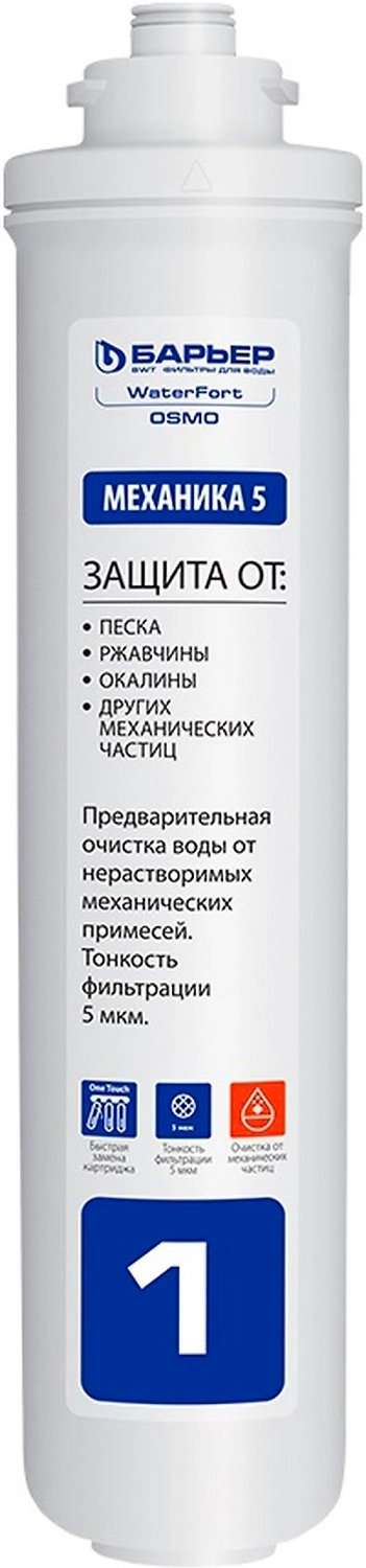 - 1 ступень: WaterFort Механика (5 мкм) фильтроэлемент предварительной очистки от механических загрязнений песка, ржавчины, окалины, различных нерастворимых частиц.
