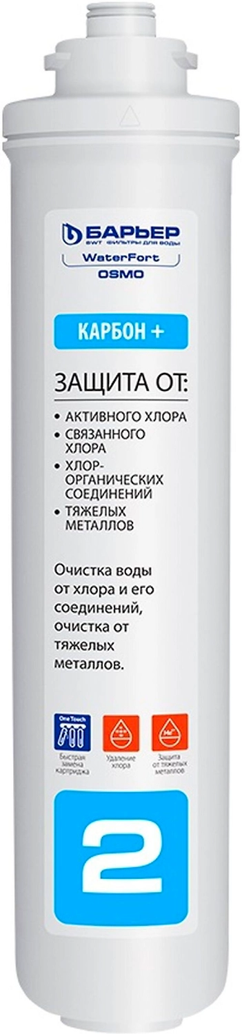 - 2 ступень: WaterFort Карбон+ обеспечивает эффективную сорбционную очистку воды от активного хлора и его соединений, тяжелых и токсичных металлов. Защищает обратноосмотическую мембрану от хлора, тем самым продлевая срок ее службы.