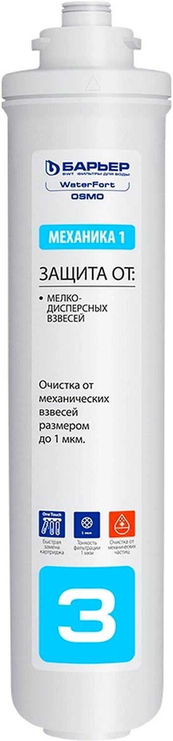 - 3 ступень: WaterFort Механика (1 мкм) фильтроэлемент механической очистки. Задерживает мелкодисперсные взвеси размером до 1 мкм.