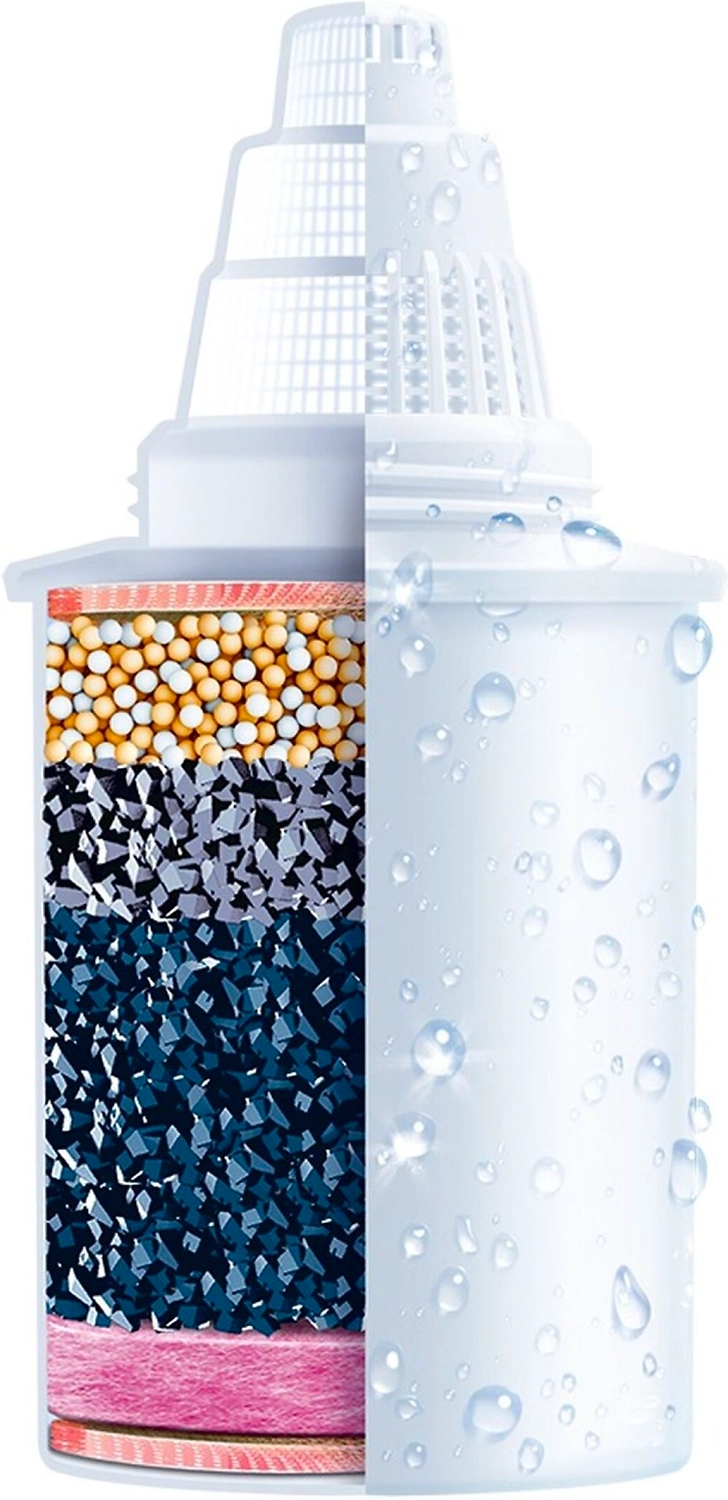 Вода, пропущенная через картридж, проходит несколько стадий очистки. Изначально она обрабатывается кокосовым активированным углем (пресованным и углем с содержанием серебра), а затем ионообменной смолой.