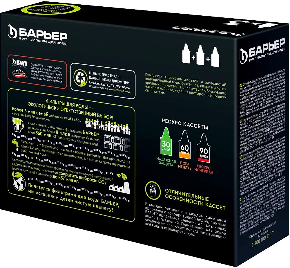 Кассета имеет уникальную технологию очистки: Технология NanoPlus: увеличивает сорбционную емкость активных компонентов кассеты. Смесь ионообменных смол: снижает общую жесткость. Кокосовый активированный уголь, обработанный серебром: предотвращает рост бактерий. Кокосовый активированный уголь: удаляет побочные продукты хлорирования. Ионообменное волокно: удаляет тяжелые металлы и растворенное железо. Фильтрующая кассета Барьер "Комплекс" (Жесткость/Железо) разработана на основе последних достижений в технологии очистки воды. В ней использованы наиболее эффективные материалы и компоненты. Тем не менее, ресурс кассеты ограничен, и для того, чтобы фильтр продолжал очищать воду с прежней эффективностью, кассету необходимо своевременно менять.