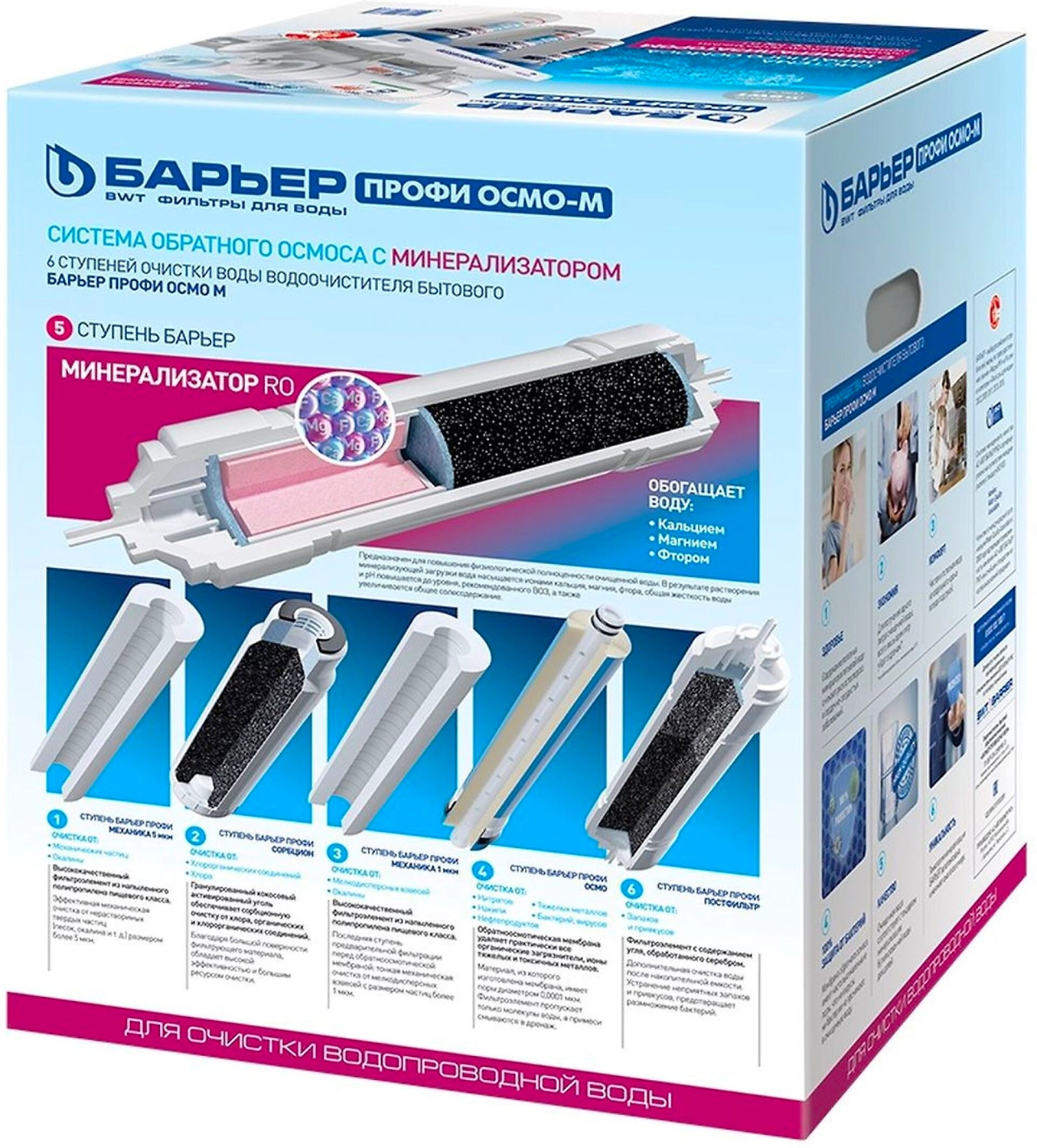 Комплект Барьер ПРОФИ Осмо 100 М - высокоэффективная многоступенчатая система фильтрации воды, основанная на перспективном методе обратного осмоса. Проходя через шесть картриджей, вода очищается от механических загрязнений, хлора, железа, ржавчины, тяжелых металлов, солей жесткости, нитратов, нефтепродуктов, фенола, других примесей и органических соединений, а также от неприятного привкуса и запаха. Мембраны обратного осмоса не пропускают вирусы и бактерии. После очистки минерализатор обогащает воду необходимыми для здоровья человека фтором, магнием и кальцием. Полезный объем накопительной емкости 8 л. Общий объем накопительной емкости 12 л