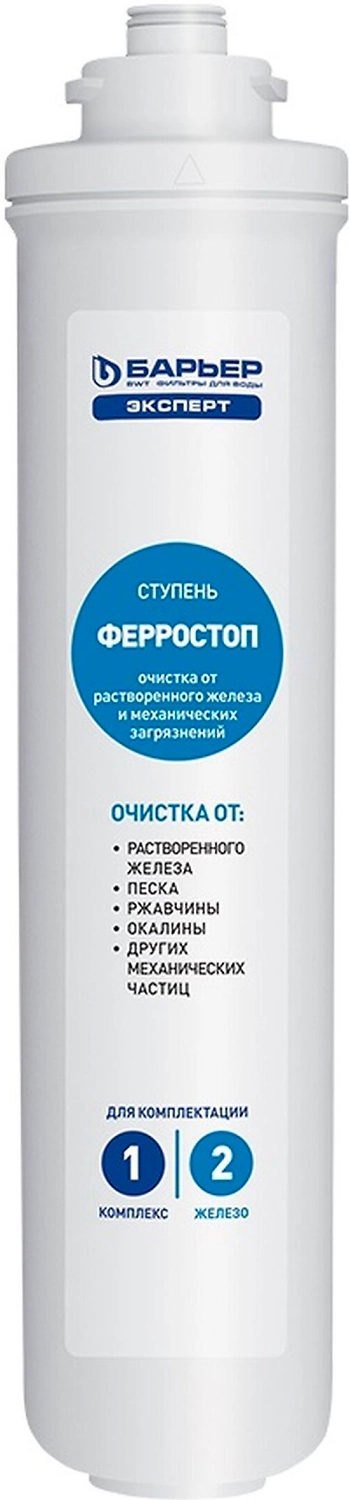 1\. "БАРЬЕР ЭКСПЕРТ Ферростоп" содержит специальный многослойный материал, эффективно удаляющий не только железистые примеси, но и растворенное железо. Финишный слой препятствует сбросу отфильтрованного железа в чистую воду.