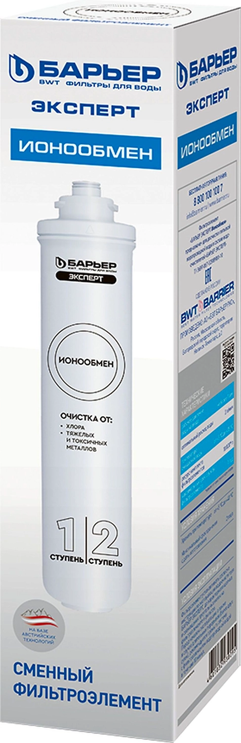 Картридж для фильтров "Барьер Expert". Фильтроэлемент Expert "Ионообмен" — высокоэффективный картридж на основе уникальной четырехкомпонентной фильтрующей засыпки, включающей в себя два вида ионообменной смолы, ионообменное волокно и гранулированный активированный кокосовый уголь, обработанный серебром. Обеспечивает высокую эффективность очистки от тяжелых и токсичных металлов.