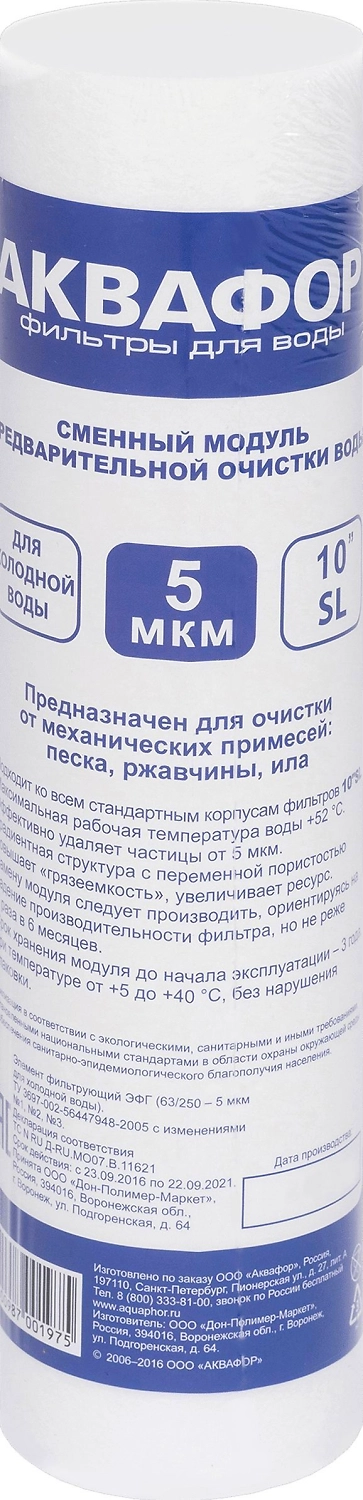 Изготовлен из полипропилена. Градиентная структура с переменной пористостью повышает "грязеемкость", увеличивая ресурс. Надежно удаляет песок, грязь, взвеси и другие нерастворимые примеси размером от 5 мкм.Предназначен для предфильтров АКВАФОР для холодной воды, подходит к любым другим фильтрам стандартной длины 254 мм (10''SL).