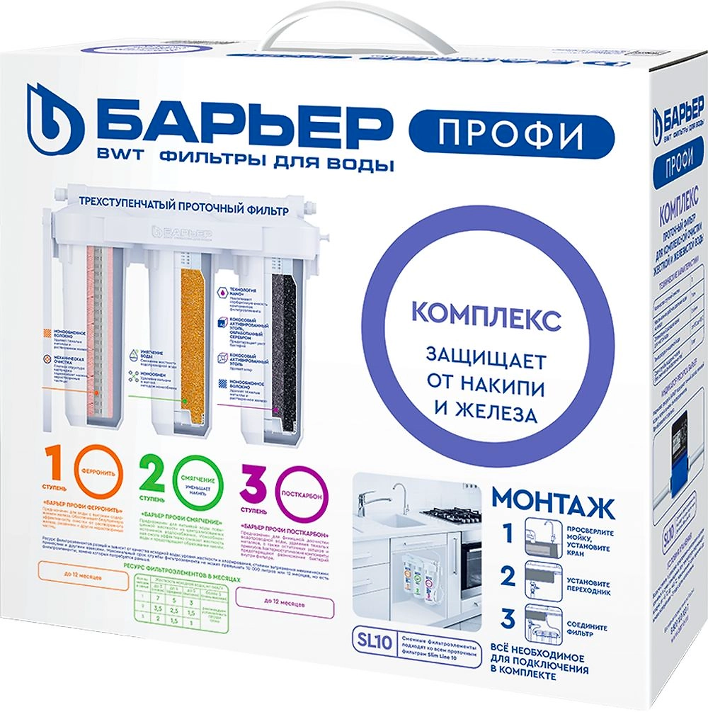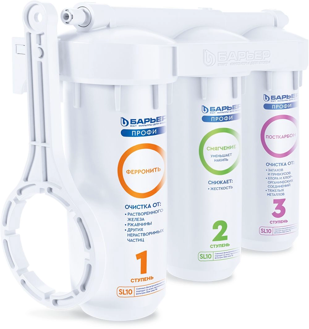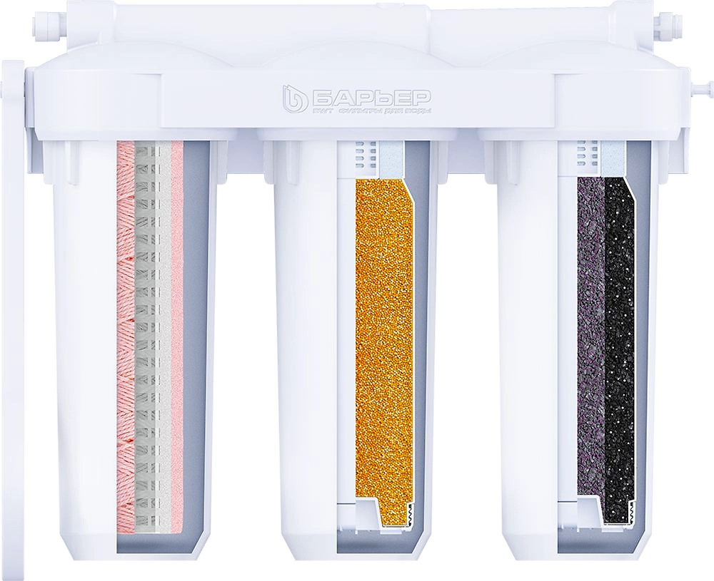 - 3. "БАРЬЕР ПРОФИ Посткарбон" убирает тяжелые металлы, кондиционирует воду, устраняет неприятные привкусы и остаточный хлор. В комплекте: Картридж Профи Ферронить, Картридж Профи Смягчение, Картридж Профи ПостКарбон
