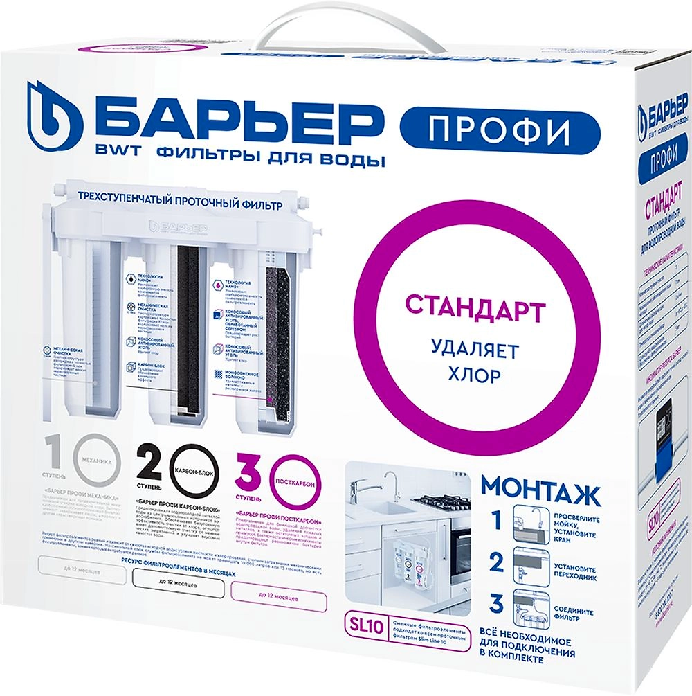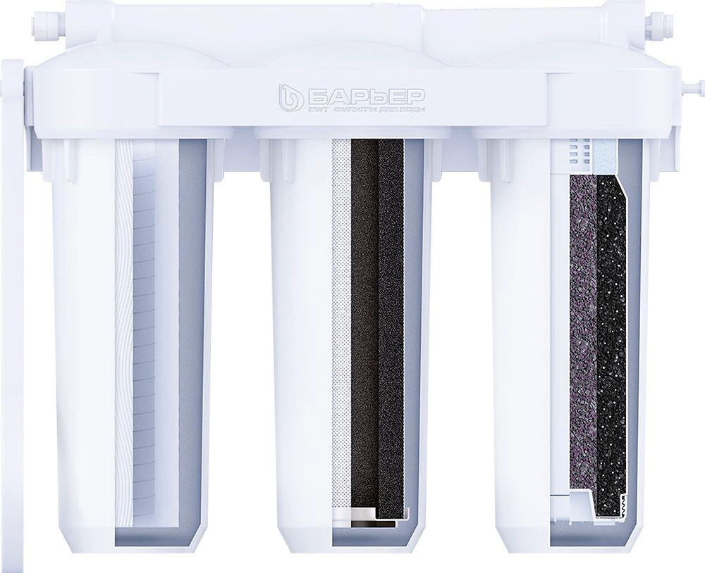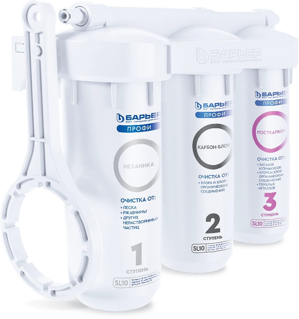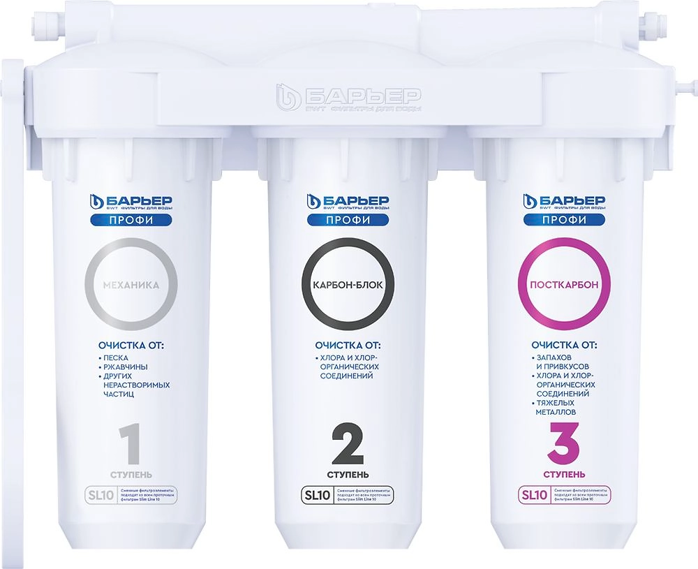 Классическая трехступенчатая система с картриджами стандарта SL 10. Обеспечивает базовую очистку от основных наиболее распространенных загрязнителей и умягчает ее до гигиенической нормы за счет трех ступеней. Очистка производится в три этапа: 1. "БАРЬЕР ПРОФИ Механика 5 мкм" удаление любых механических примесей до 5 мкм (песок, пластик, ржавчина, окалина и прочее). 2. "БАРЬЕР ПРОФИ Карбон-блок" благодаря качественному активированному углю удаляет хлор, органические соединения, фенол и другие вредные вещества. 3. "БАРЬЕР ПРОФИ Посткарбон" убирает тяжелые металлы, кондиционирует воду, устраняет неприятные привкусы и остаточный хлор. В комплекте: Картридж Профи Механика 5 мкм, Картридж Профи Карбон-блок, Картридж Профи ПостКарбон