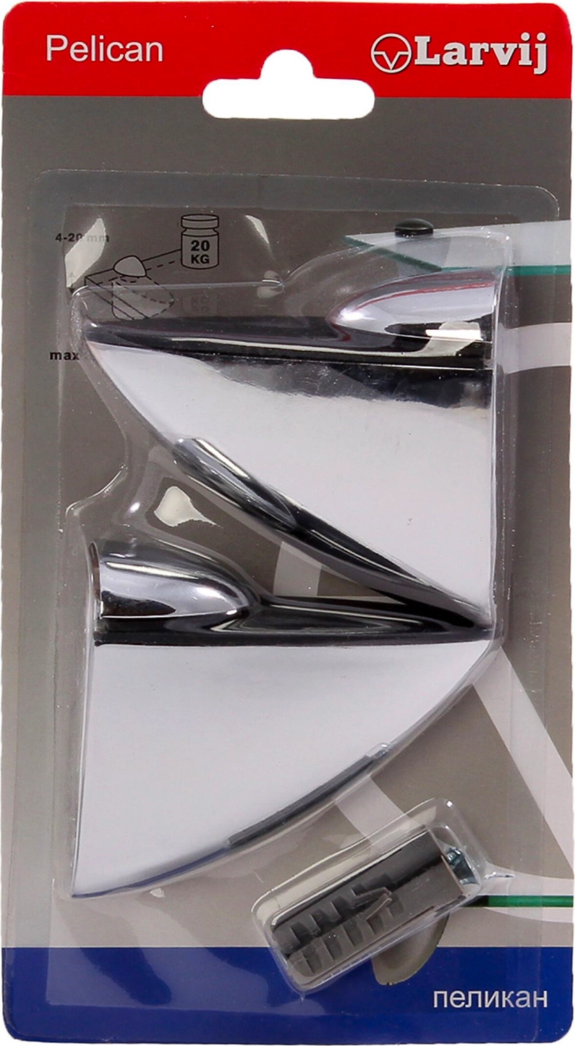 Декоративный полкодержатель конструкции Пеликан используется для крепления стеклянных и деревянных полок к стене. Позволяет регулировать толщину вставляемой полки от 4 до 24 мм, максимальная нагрузка 18 кг. Пеликаны Larvij комплектуются шурупами и дюбелями.
