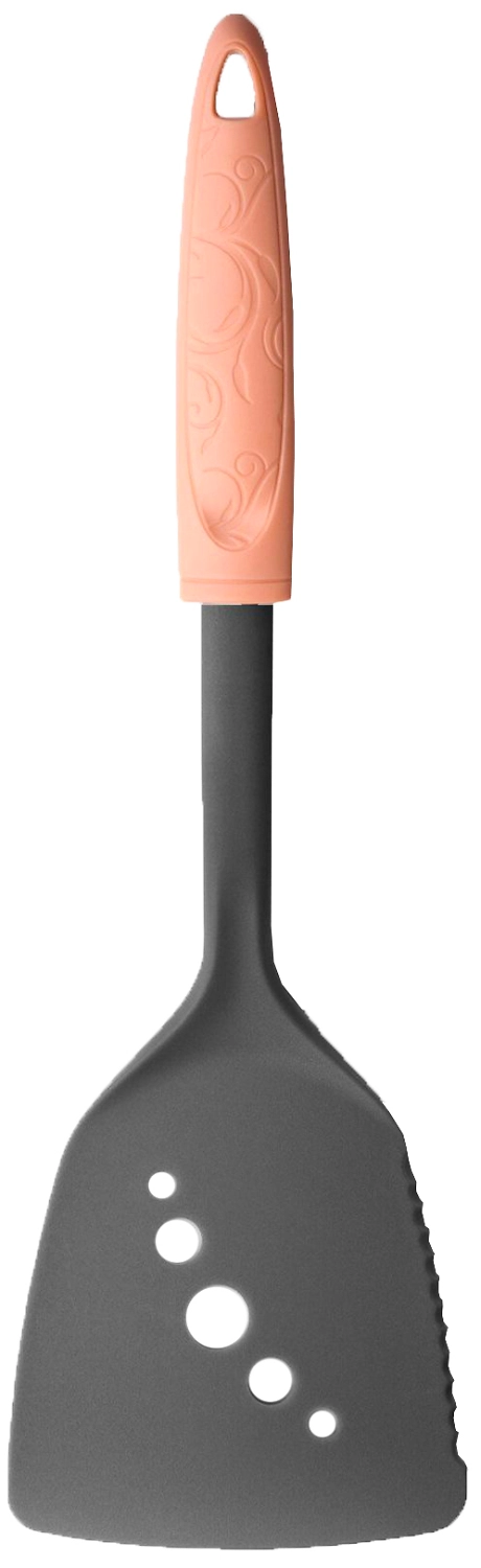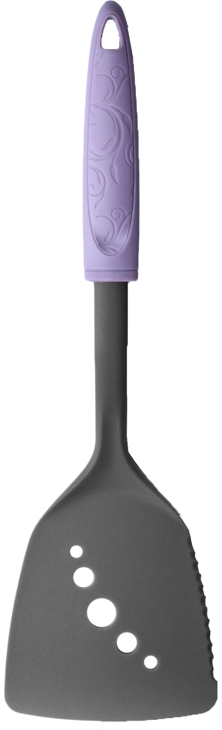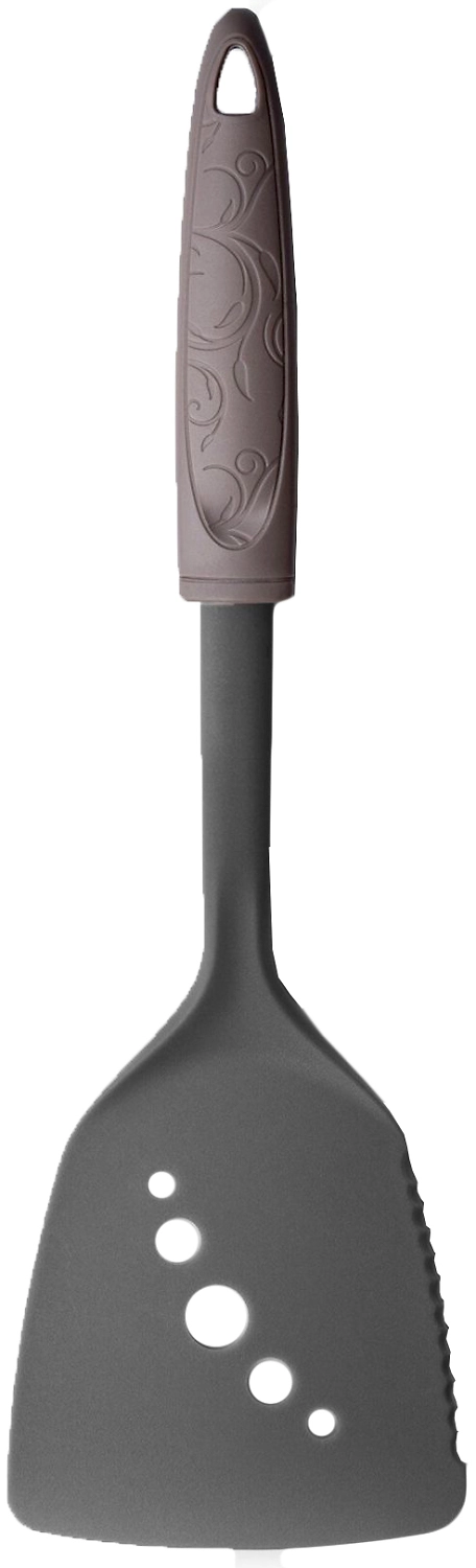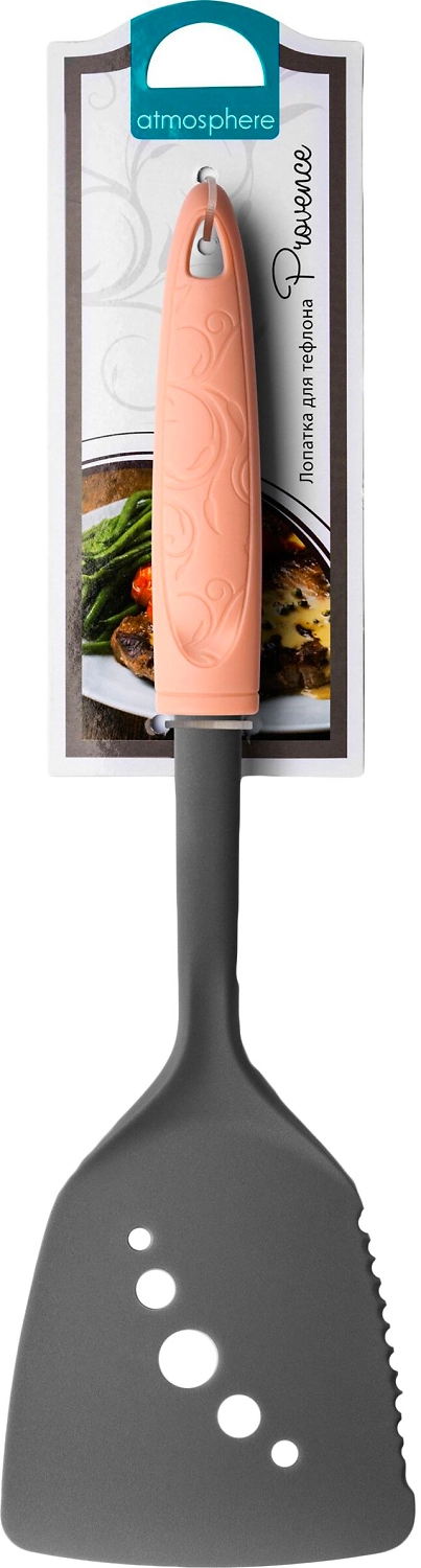 Лопатка, подходящая для использования на тефлоновых поверхностях. Снабжена небольшой заточкой для разделывания пищи в сковороде, не повреждая её поверхности. Имеет эргономичную пластиковую ручку с элегантным декором. Состав: нейлон.