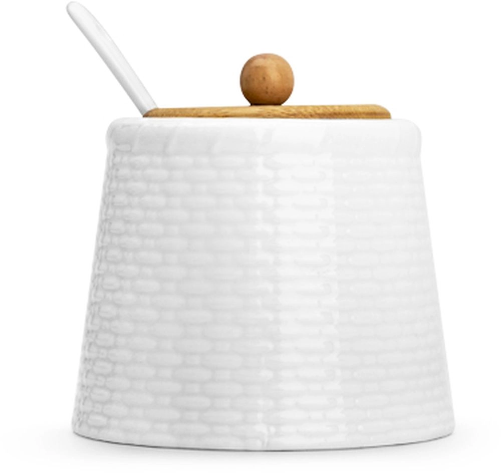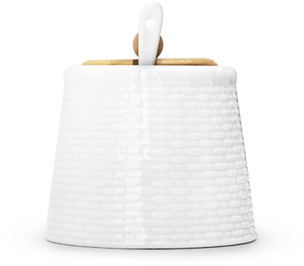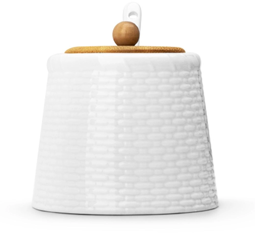 Фарфоровая сахарница с крышкой из экологически чистого материала - бамбука. Выполнена в лаконичном современном дизайне, имеет рельефный декор внешней поверхности.