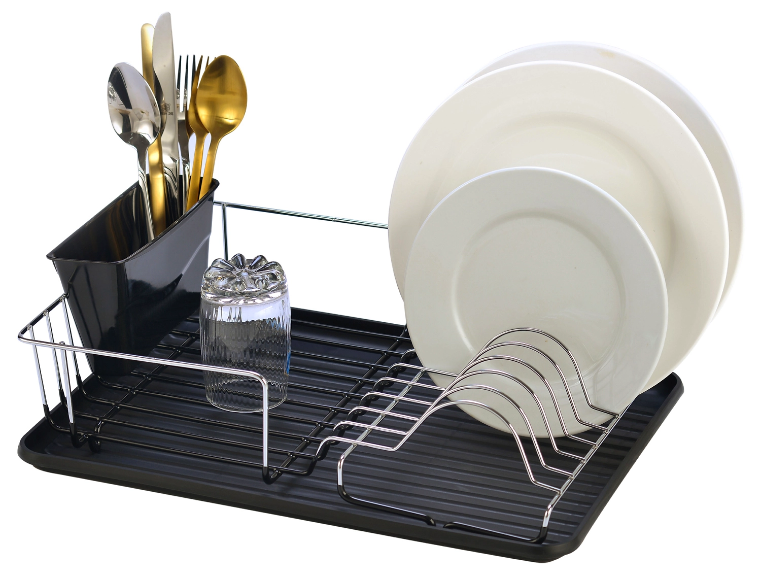Сушилка для посуды изготовлена из нержавеющего хромированного металла и пластика.