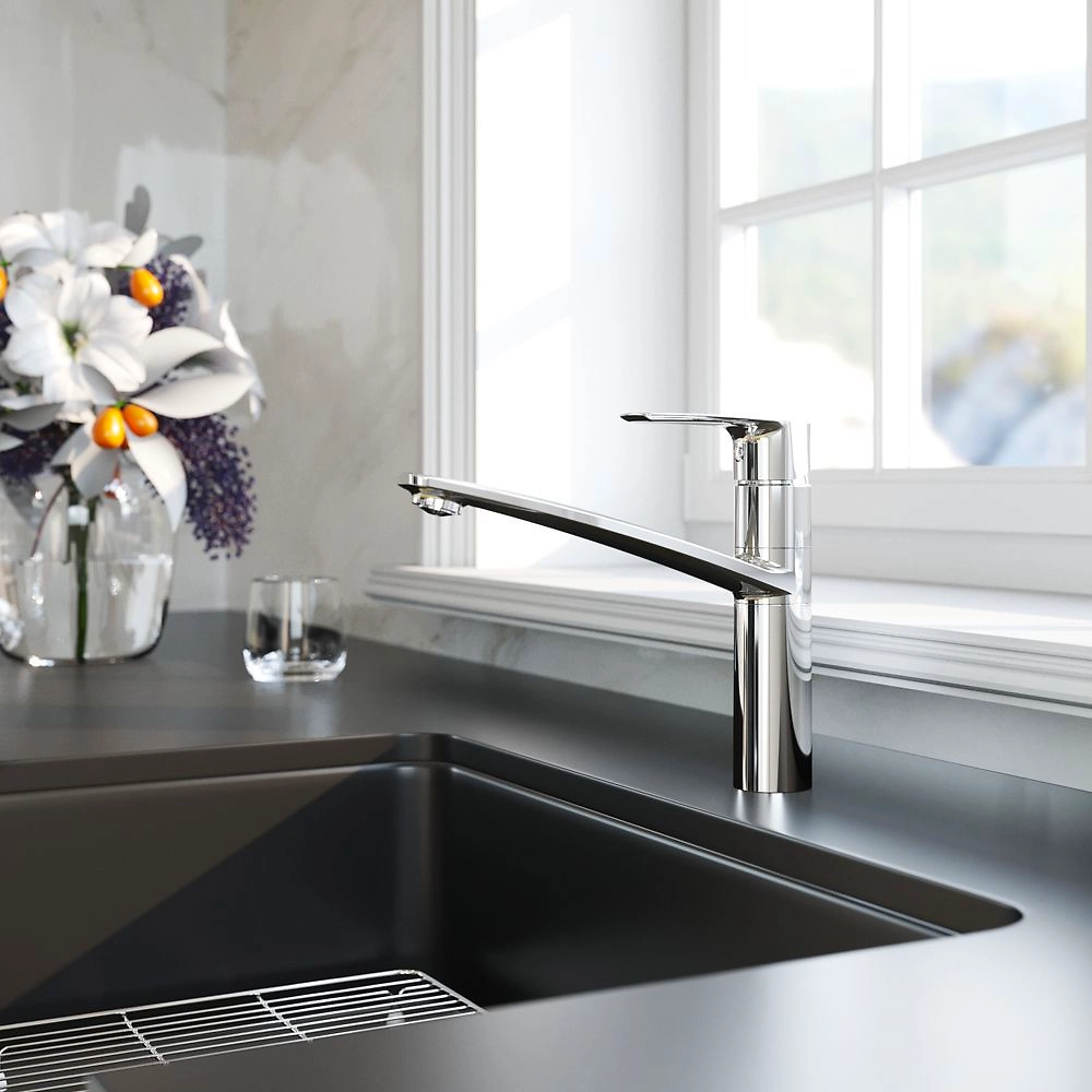 - Модель с высоким поворотным изливом удобна для мытья посуды и наполнения больших емкостей в раковине любой глубины.