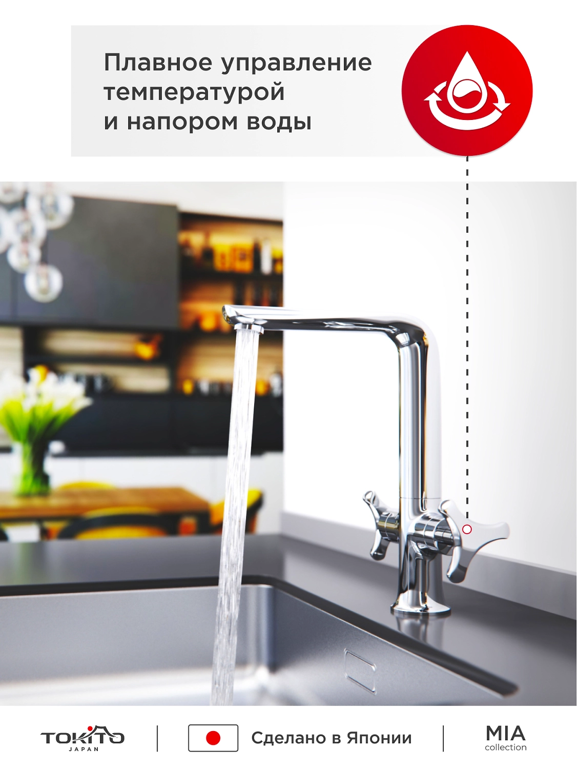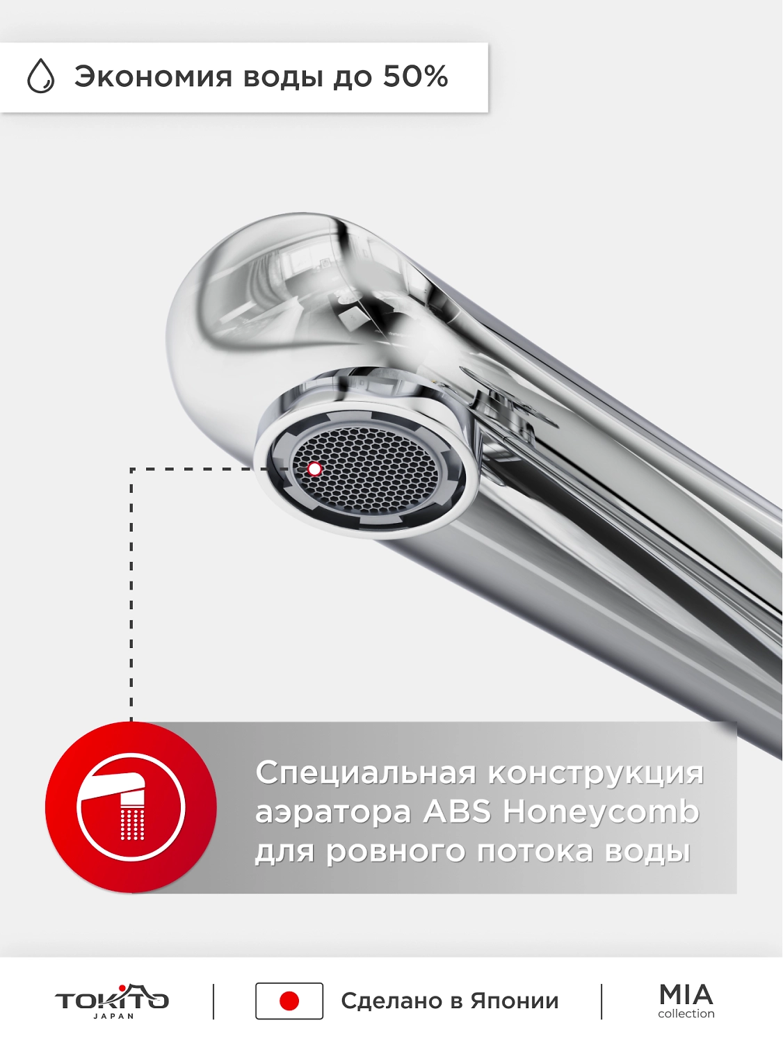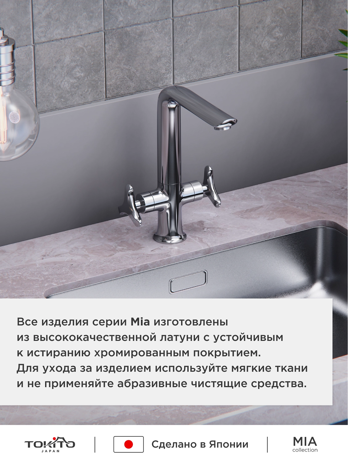 Элегантный кухонный смеситель коллекции MIA - новая дизайнерская разработка ведущего японского бренда TOKITO. Высокий вращающийся излив оригинальной формы обеспечит комфорт в процессе пользования раковиной и станет частью вашего стильного интерьера. Классическое двухвентильное управление позволяет точно регулировать температуру воды. Латунный корпус, покрытый хромовым составом, устойчив к коррозии и не теряет своего безупречного глянцевого блеска даже спустя несколько лет. В конструкцию смесителя серии MIA входит аэратор, который помогает экономить воду и создает равномерный поток.