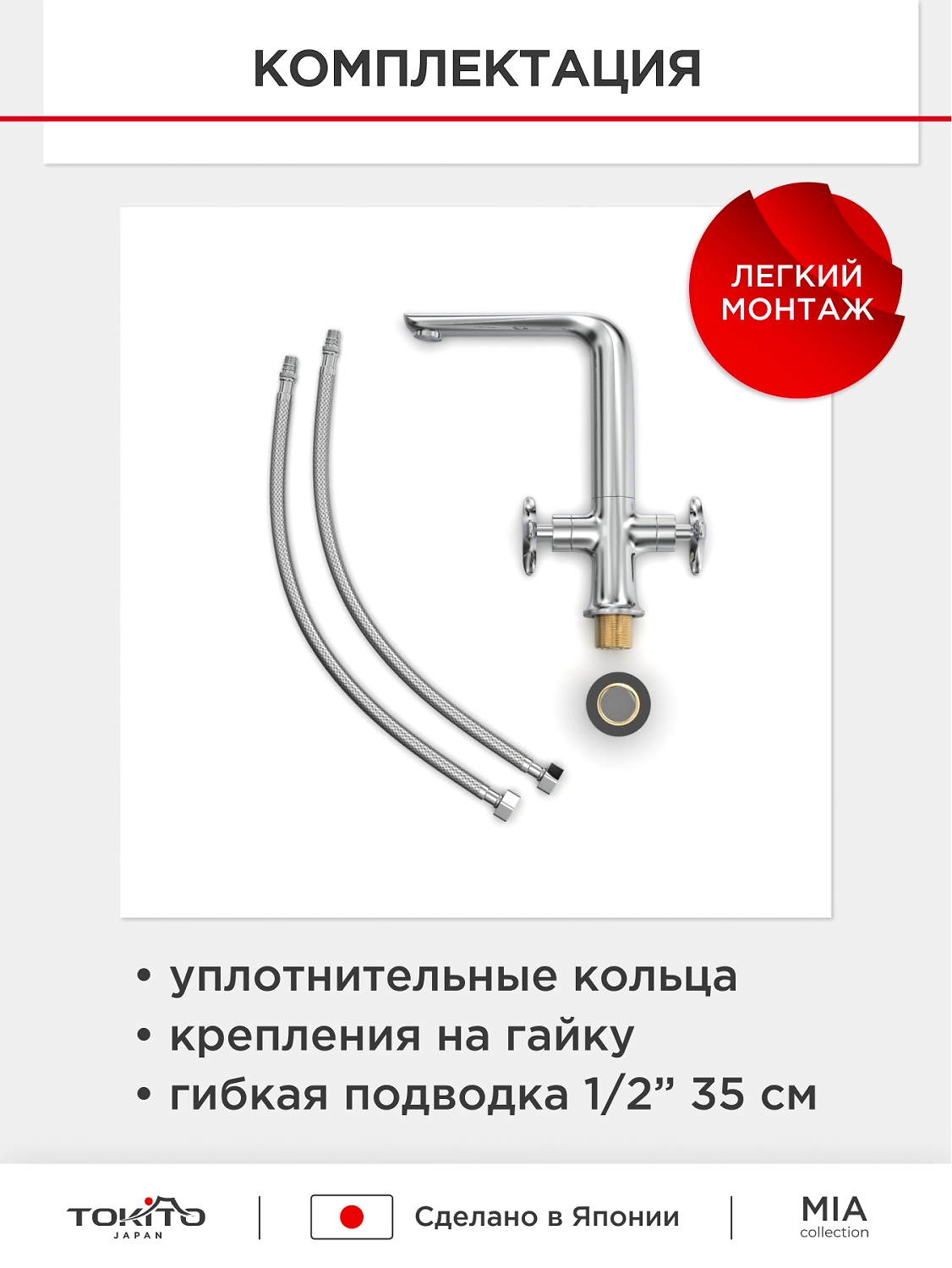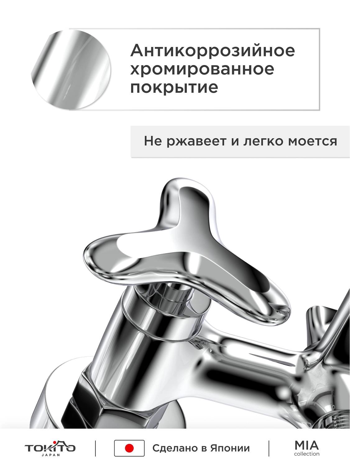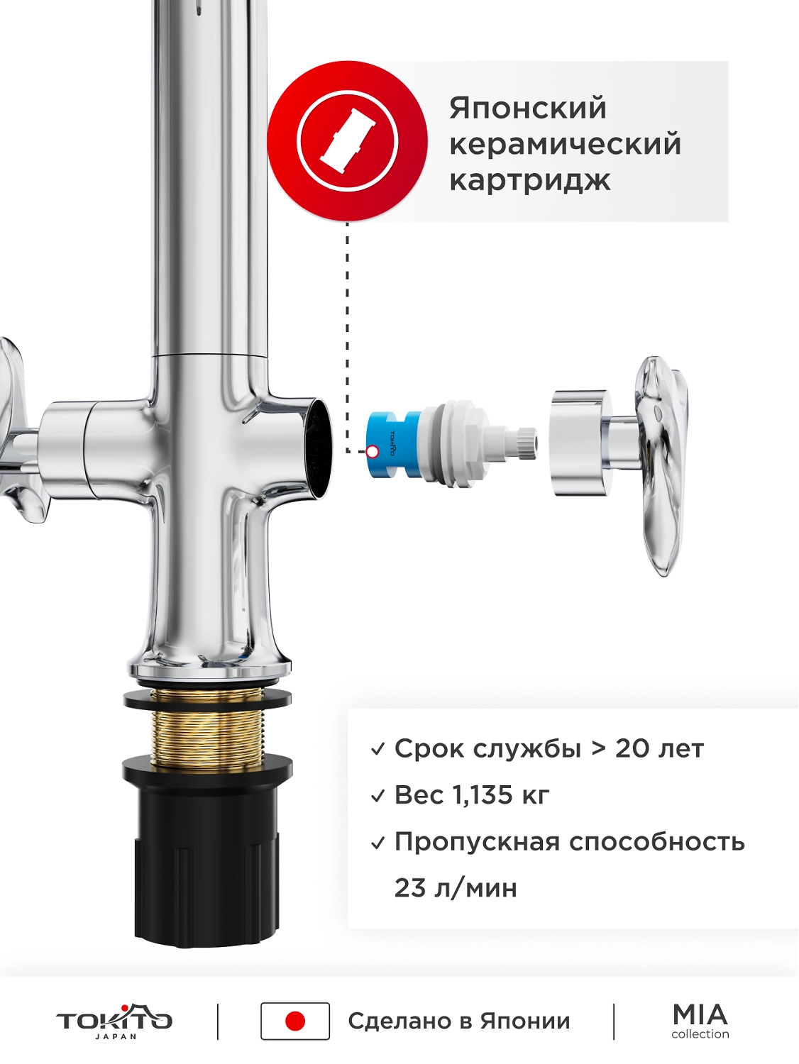 Элегантный кухонный смеситель коллекции MIA - новая дизайнерская разработка ведущего японского бренда TOKITO. Высокий вращающийся излив оригинальной формы обеспечит комфорт в процессе пользования раковиной и станет частью вашего стильного интерьера. Классическое двухвентильное управление позволяет точно регулировать температуру воды. Латунный корпус, покрытый хромовым составом, устойчив к коррозии и не теряет своего безупречного глянцевого блеска даже спустя несколько лет. В конструкцию смесителя серии MIA входит аэратор, который помогает экономить воду и создает равномерный поток.