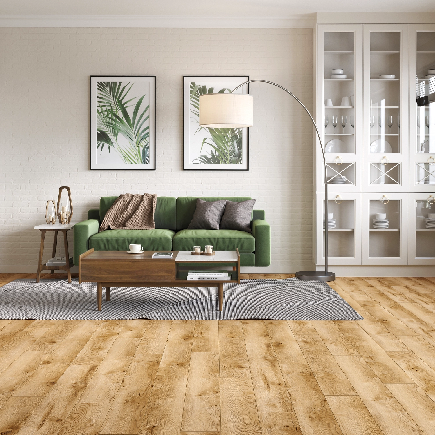 Качественная имитация дощатого пола из дуба помогает создать стильный и комфортный интерьер с индивидуальным характером. Ламинат теплого песочного оттенка органично сочетается с однотонным и ярким декором, добавляет ощущение свежести и чистоты.