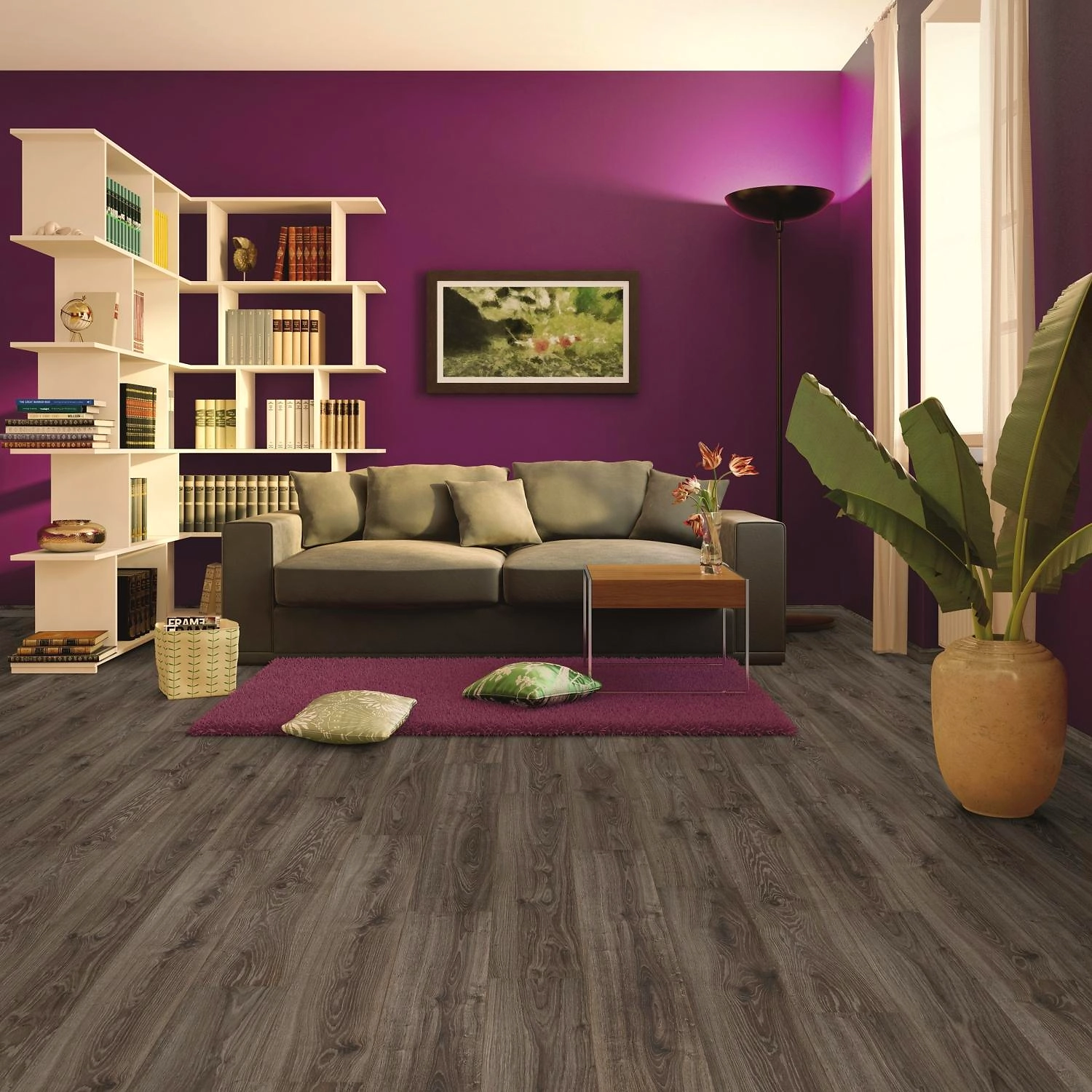 Насыщенный темный древесный рисунок ламината прекрасно дополнит интерьер любого помещения в современном стиле: модерн, хай-тек, лофт, гранж, эклектика. Пол будет органично сочетаться с мебелью и аксессуарами из натуральных материалов, характерных для стилей классицизм, прованс, кантри, шале.