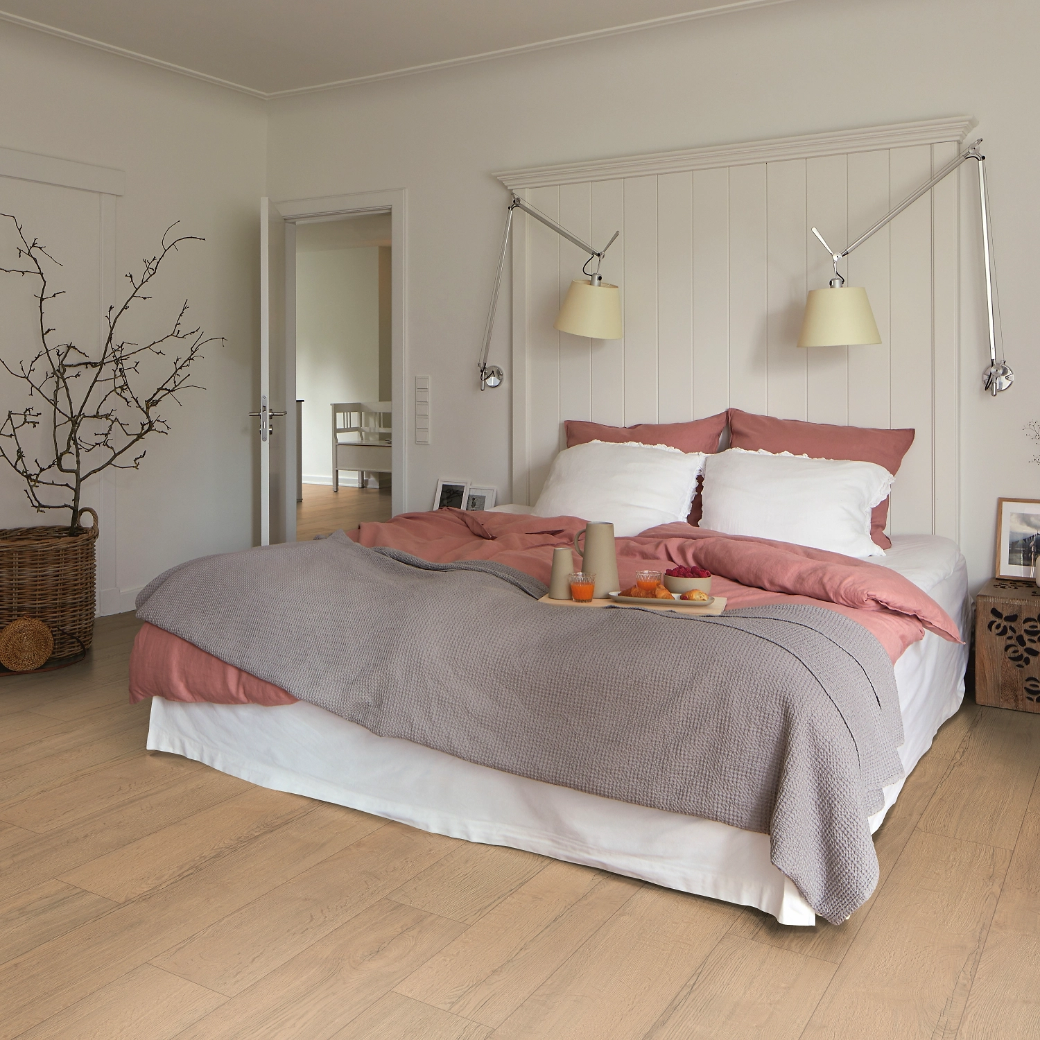 Имитация сосновой древесины в интерьере создает ощущение приятного тепла и уюта. Ламинат с уникальным тиснением поверхности поражает своим сходством со структурой натурального дерева. Такой пол великолепно сочетается со светлыми, однотонными декорами.
