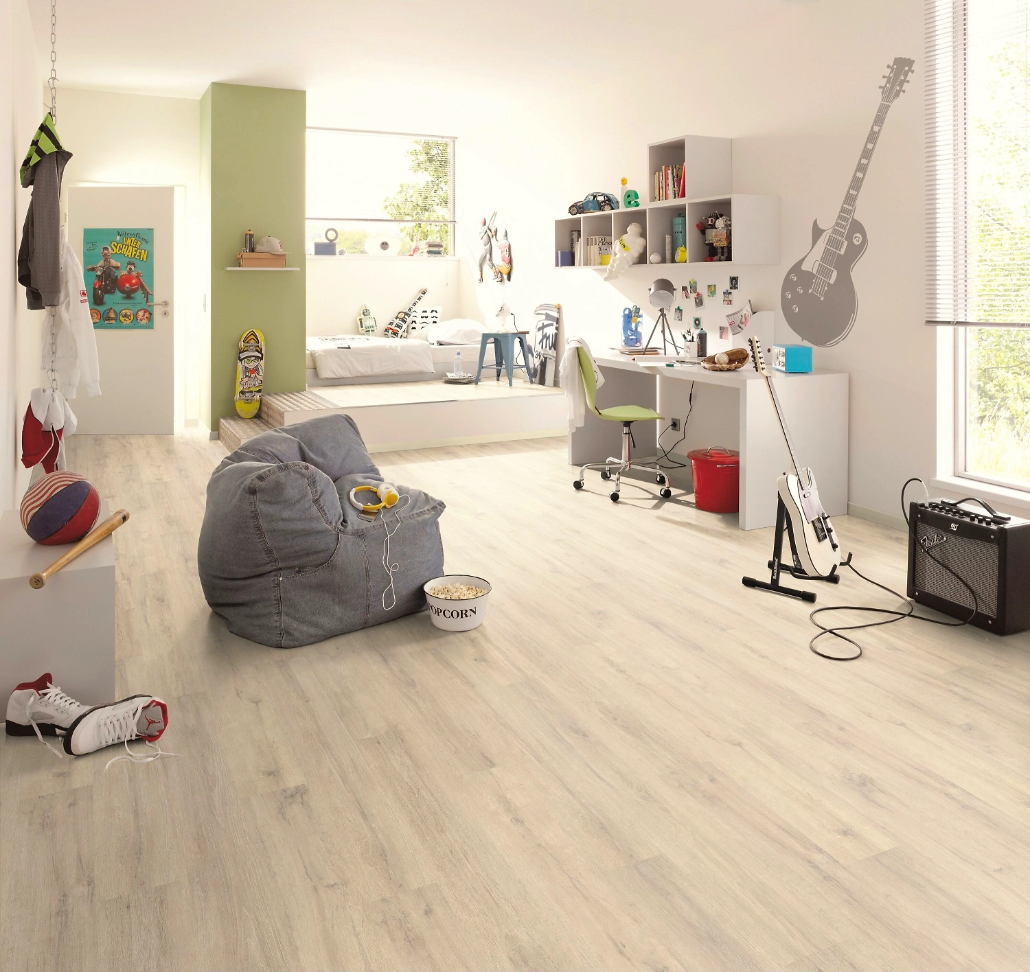Наличие фаски, визуально отделяющей половицы друг от друга, обеспечивает ламинату максимальное сходство с паркетным полом. А приятный бежевый оттенок покрытия делает помещение более объемным и светлым. Ламинат цвета Дуб Куримо хорошо смотрится в интерьерах в скандинавском стиле, шале или лофт.
