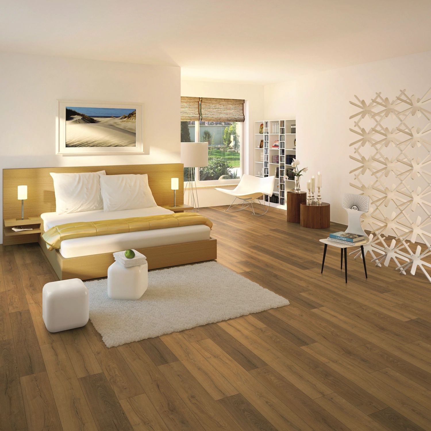 Покрытие привлекательно смотрится в любых интерьерных решениях, за счет золотисто-коричневого оттенка и природного древесного рисунка, наделяя пространство уютом и теплотой. Органично будет выглядеть ламинат в интерьерных стилях шале, прованс, модерн, классика.