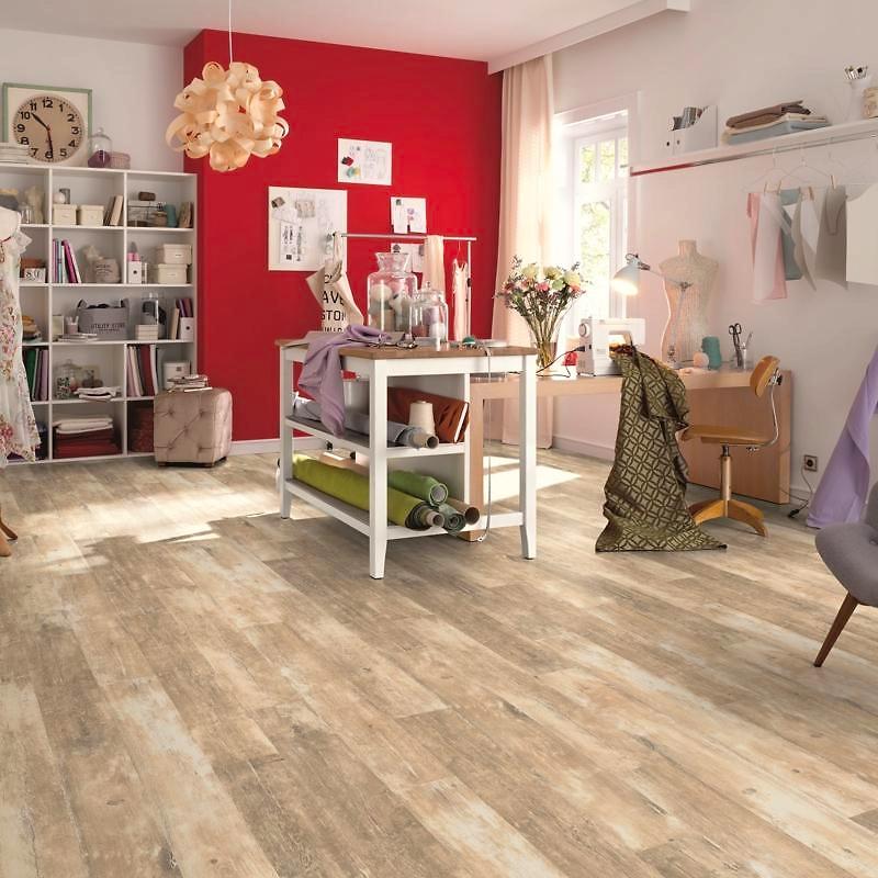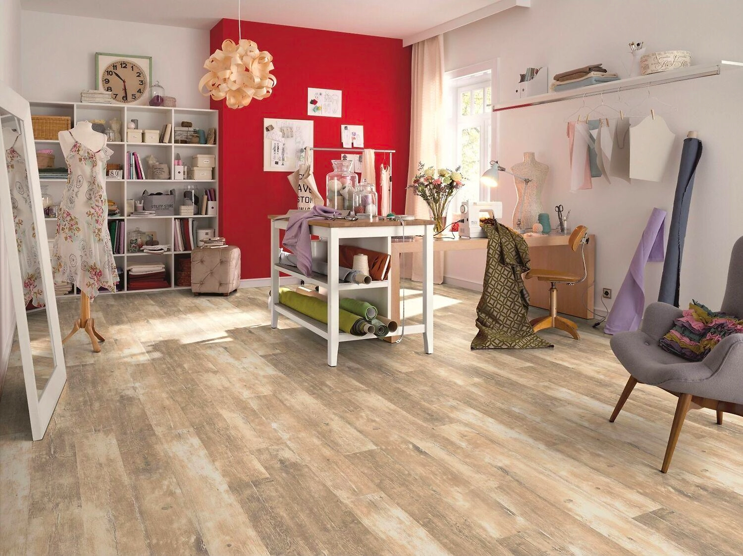 Древесный рисунок и спокойный нежный оттенок ламината имитируют натуральную деревянную поверхность. За счет подобного сходства покрытие можно использовать в любых классических или приближенных к природным мотивам интерьерах. Элегантно будет смотреться ламинат с мебелью и декором этнических стилей прованс, кантри, не менее эффектно дополнит интерьерные решения стилей лофт, китч, хай-тек, шебби-шик.