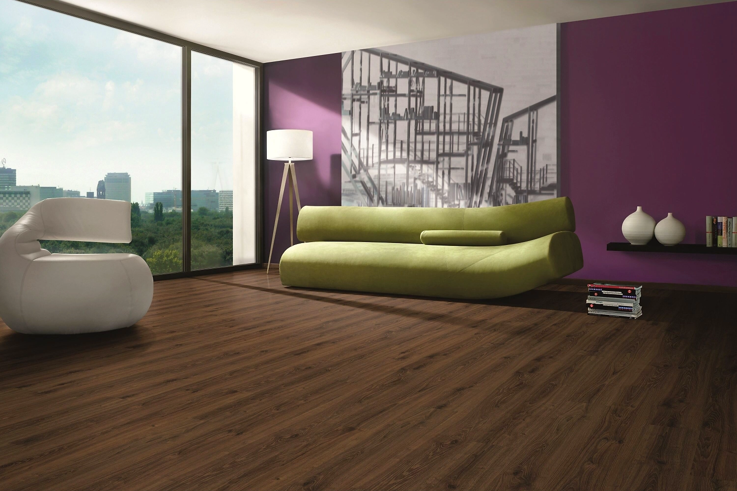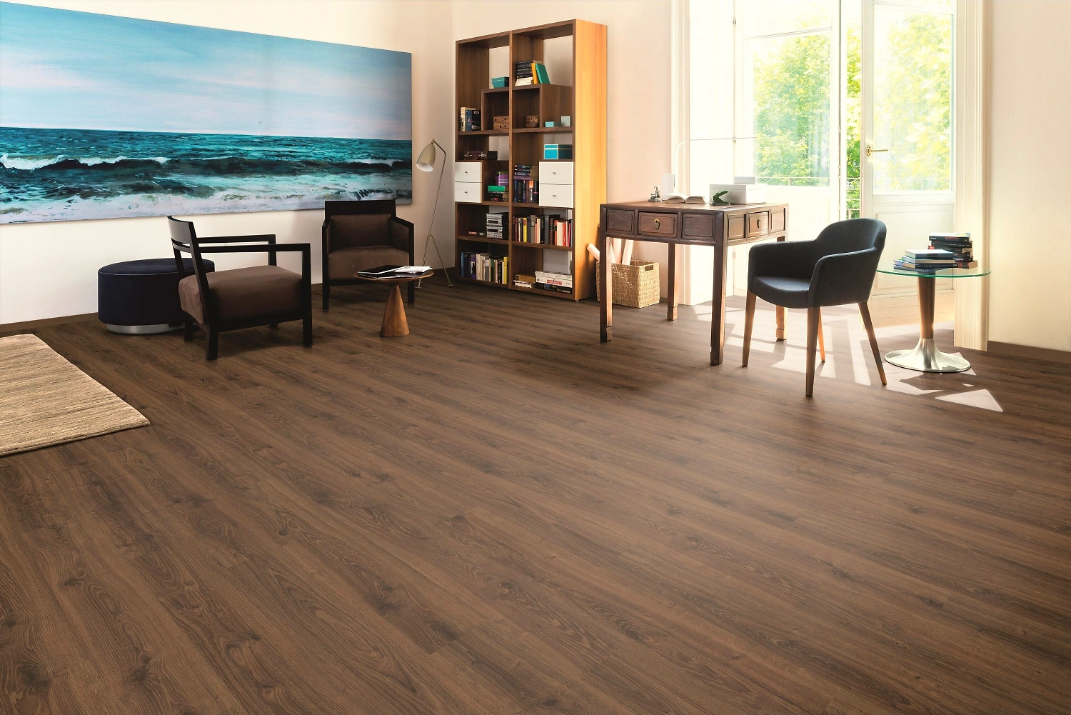 Темное покрытие с реалистичным древесным узором идеально подходит для оформления просторной гостиной, зала или прихожей. Ламинат оттенка Дуб Ставерн прекрасно гармонирует с контрастной мебелью, яркими элементами в стиле бохо или авангард.