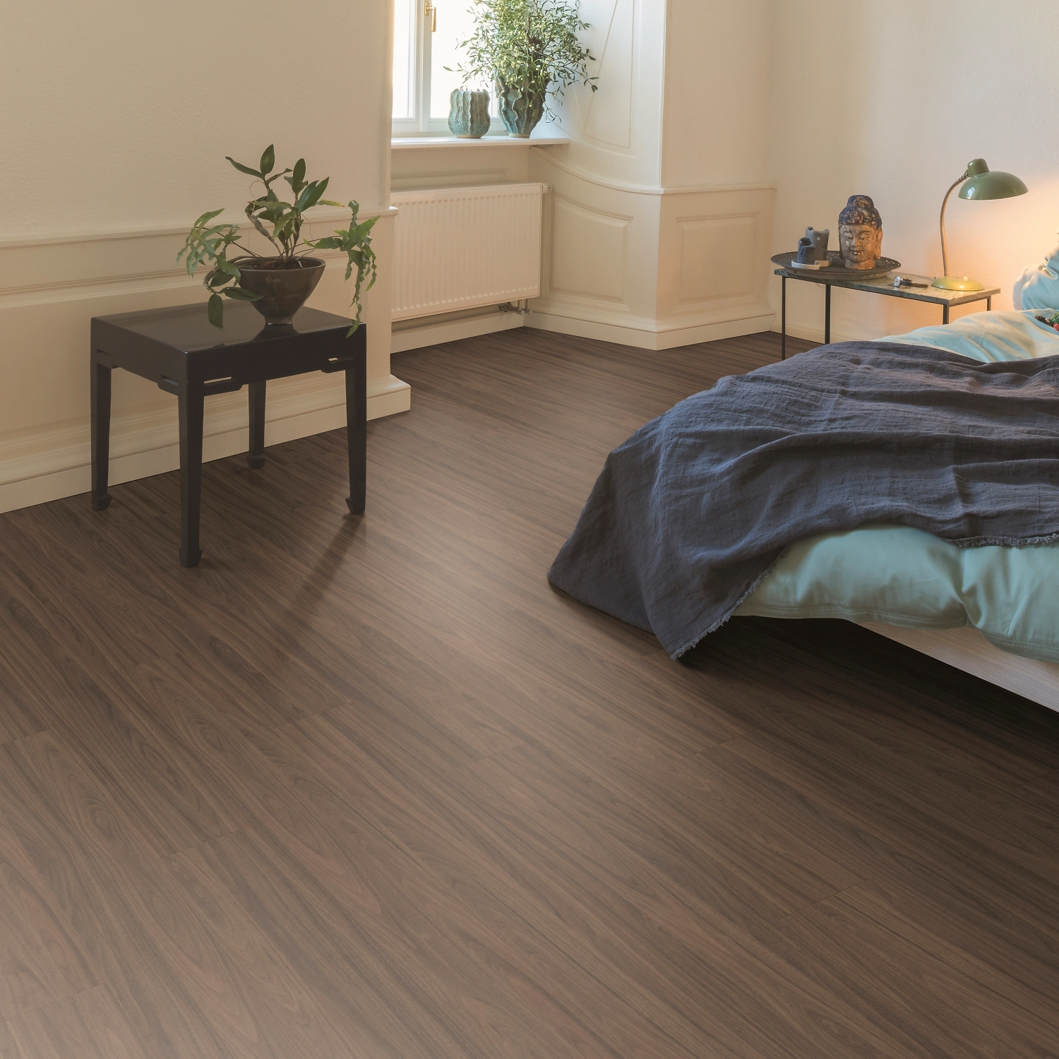 Темное напольное покрытие с реалистичным древесным узором идеально подходит для контрастных интерьеров с яркими акцентами. Ламинат красивого табачного оттенка прекрасно гармонирует с любой мебелью и декором.