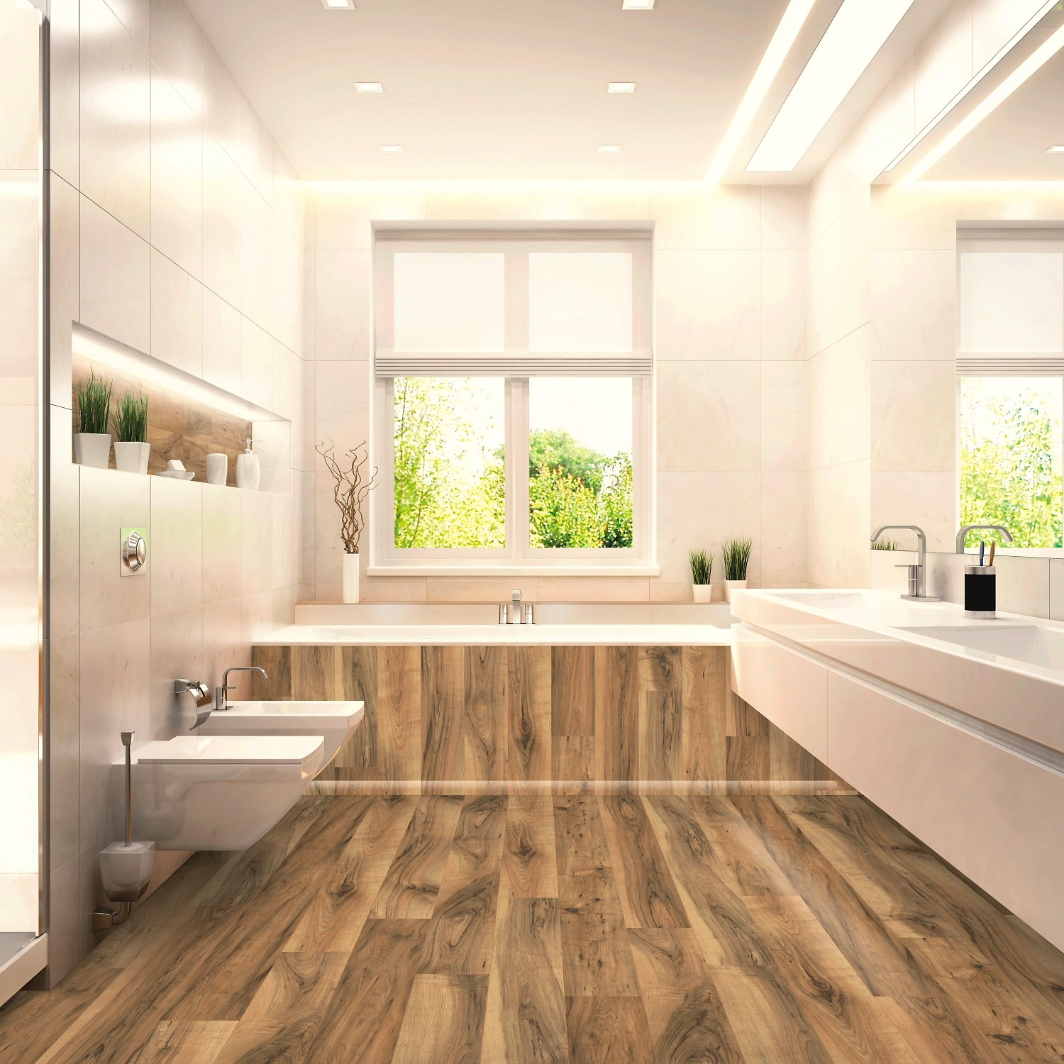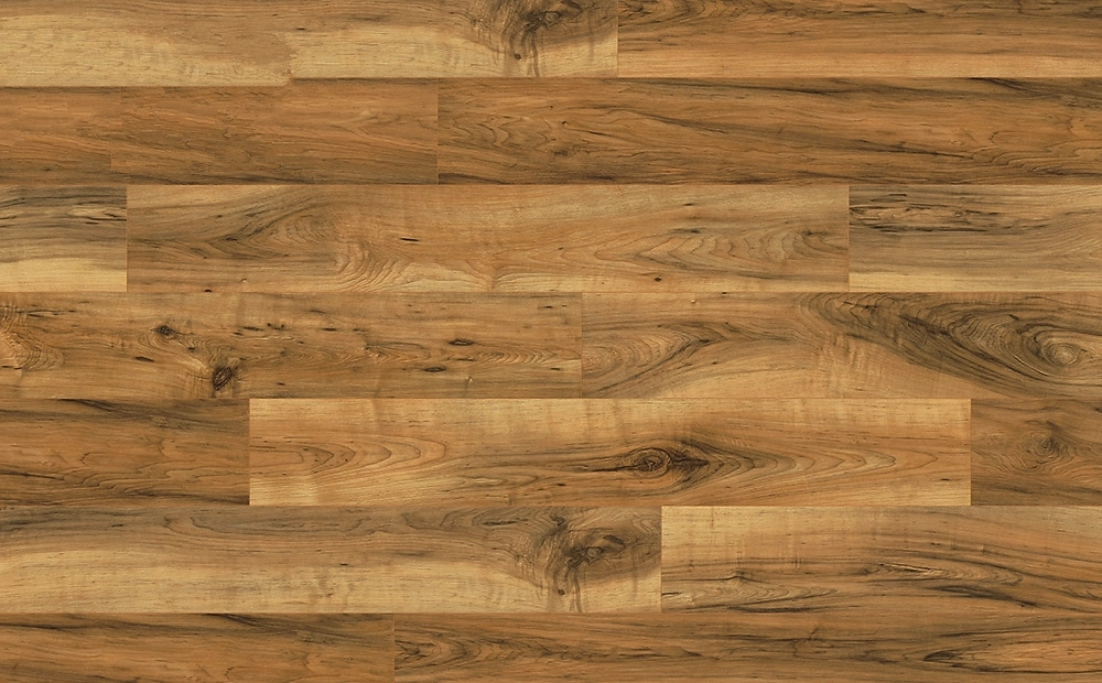 Репродукция ореха теплого коричневого оттенка выглядит аутентично за счет имитации рисунка и разнообразной текстуры натуральной древесины. Сучья, трещины, светлые и темные цветовые включения подчеркивают модную рустикальность декора. V-образная фаска по периметру увеличивает сходство половиц с досками.