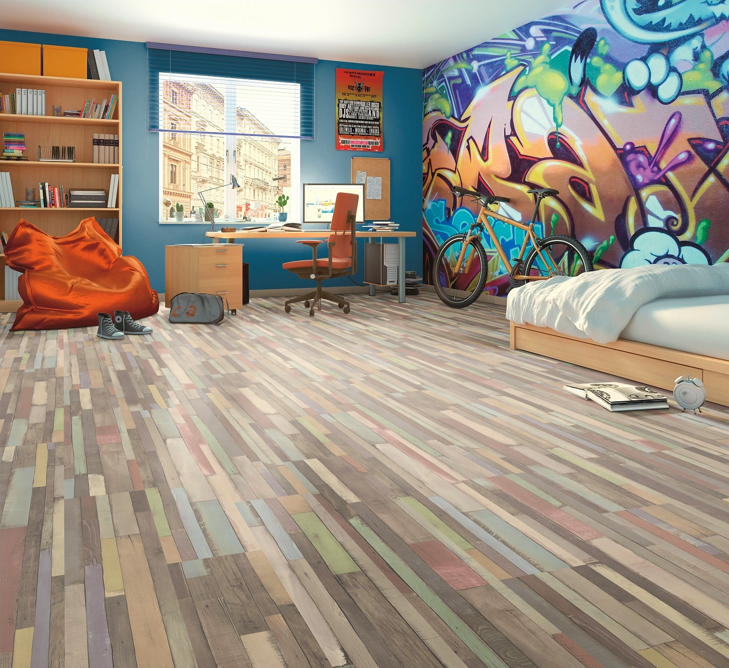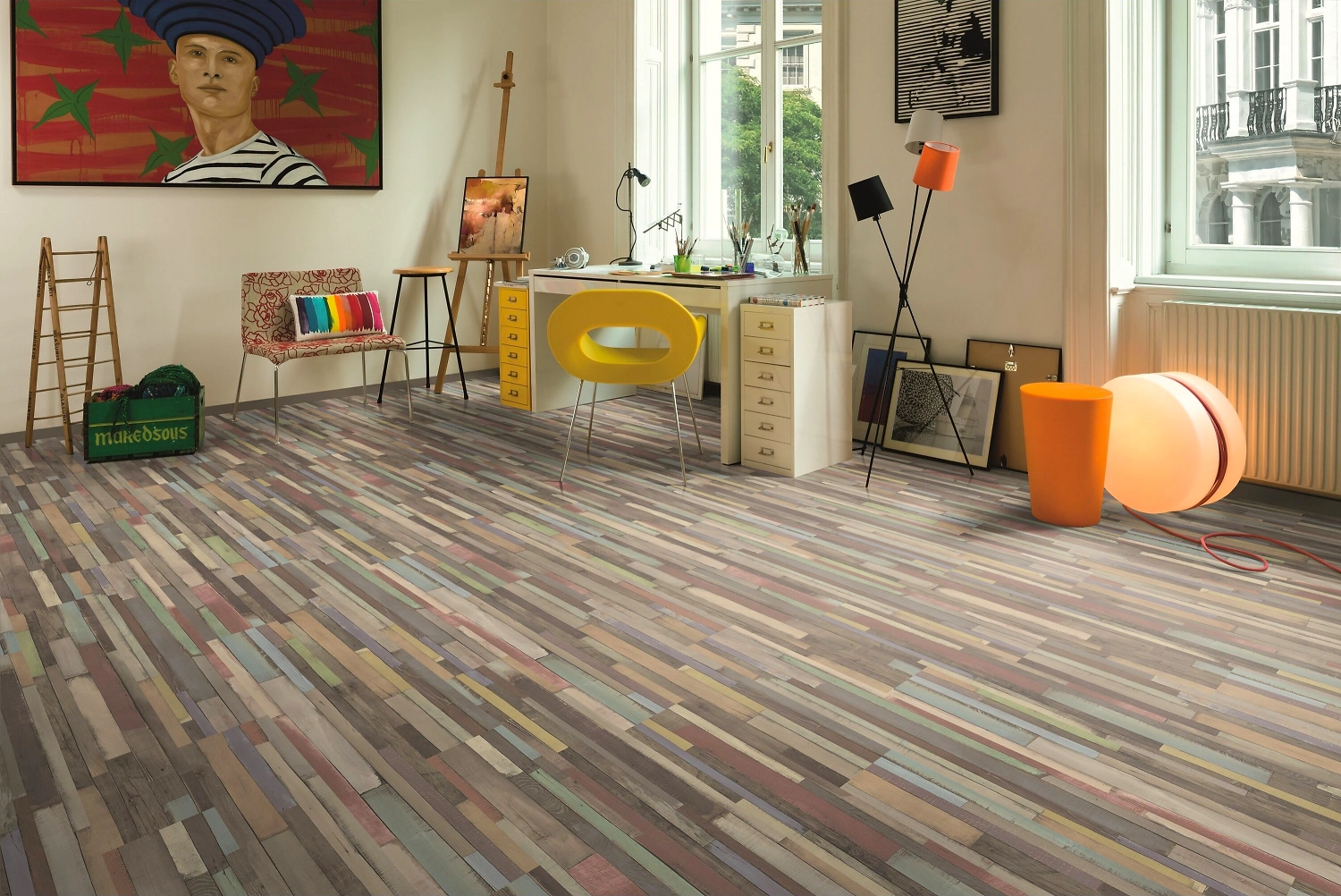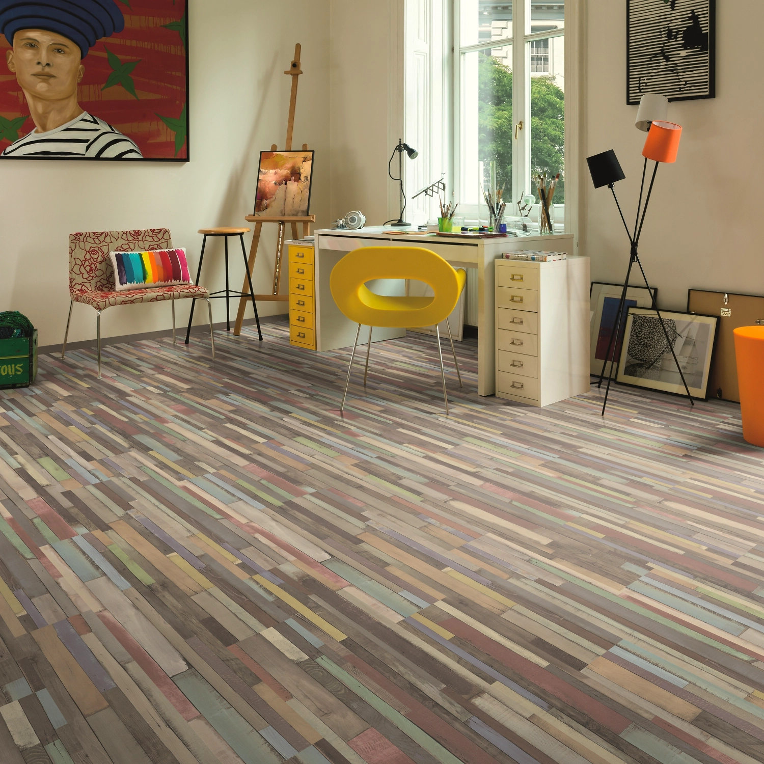Панели в виде крашеных, слегка потертых досок создают эффект состаренного деревянного пола. Такое покрытие органично впишется в интерьер жилой комнаты или офиса, оформленных в стиле гранж, авангард, кантри или лофт.