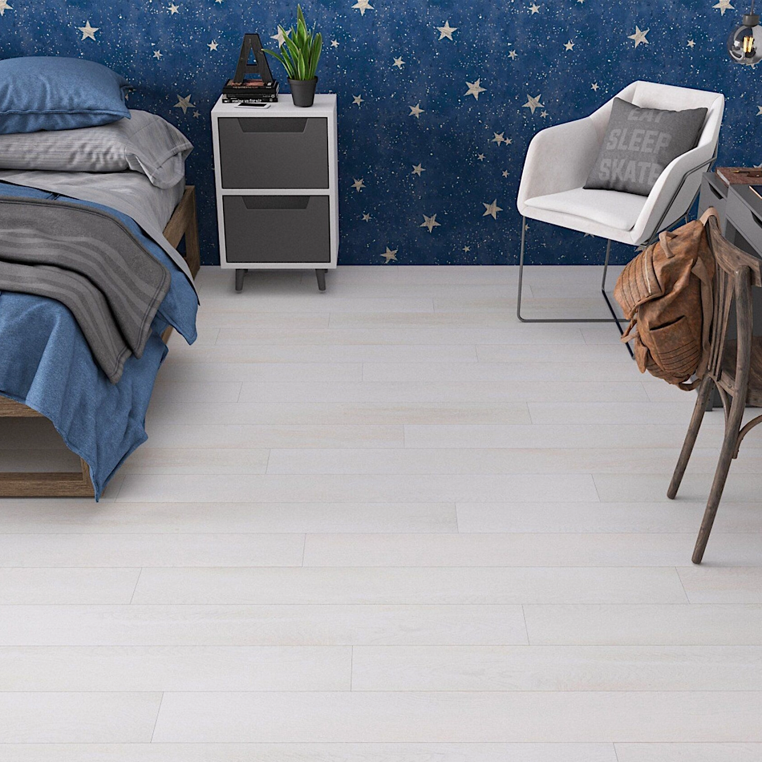 Ламинат Kastamonu FLOORPAN Indigo Дуб Дэвис - прочное покрытие 33 класса эксплуатации, предназначенное для жилых комнат и коммерческих помещений с высокой проходимостью. Белый пол подходит для интерьера в стиле минимализм, сканди, прованс, хорошо сочетается со стенами и мебелью любого цвета.