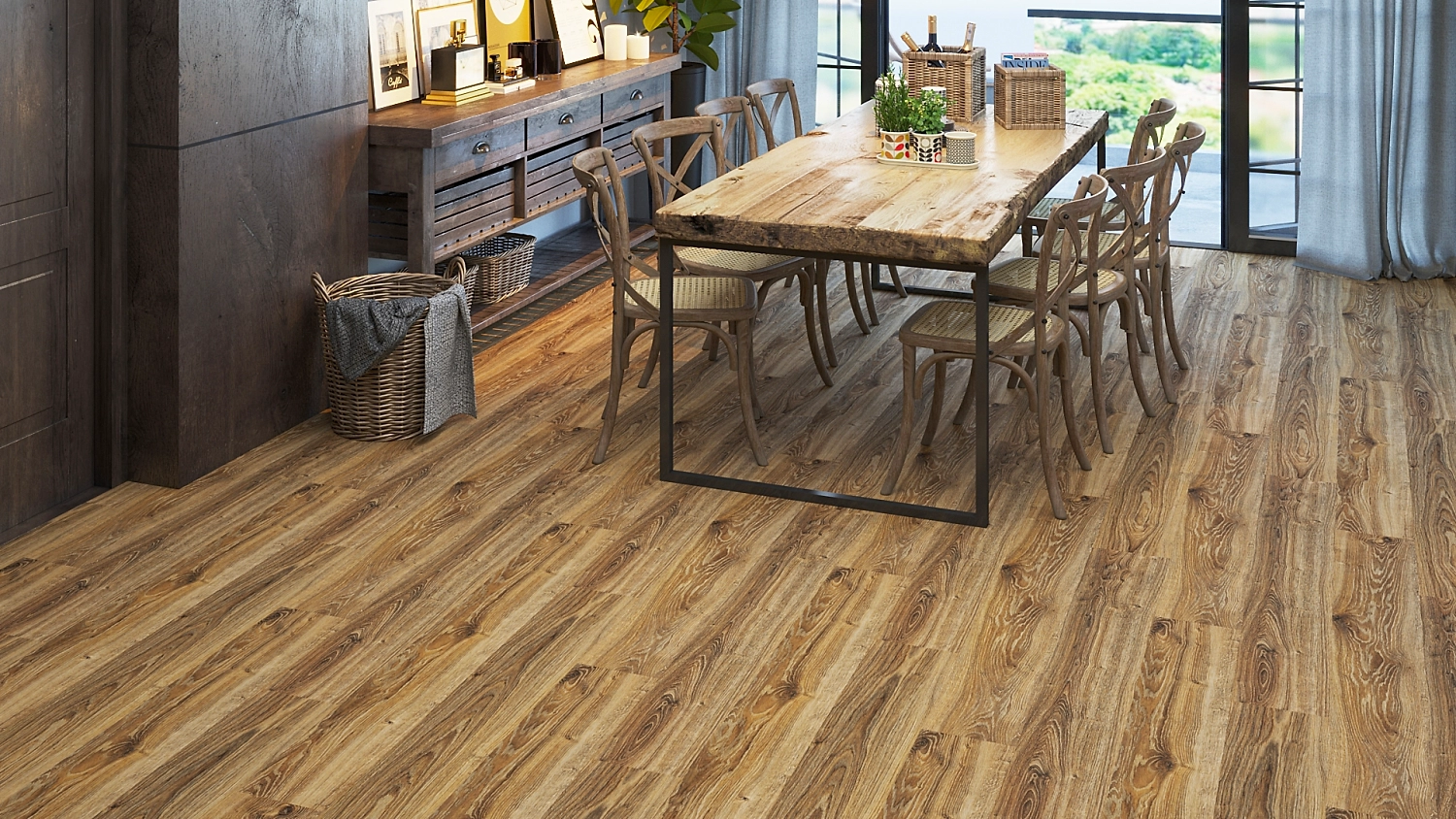 Ламинат с рустикальной структурой поверхности визуально неотличим от дубовой доски. Рисунок древесного среза наносится с высокой точностью методом цифровой печати, реалистично передает даже такие детали, как трещины от спила сучков. Напольное покрытие с преобладанием темно-коричневого цвета придает интерьеру особую теплоту, эффектно сочетается со стилями лофт, эко, винтаж, кантри.