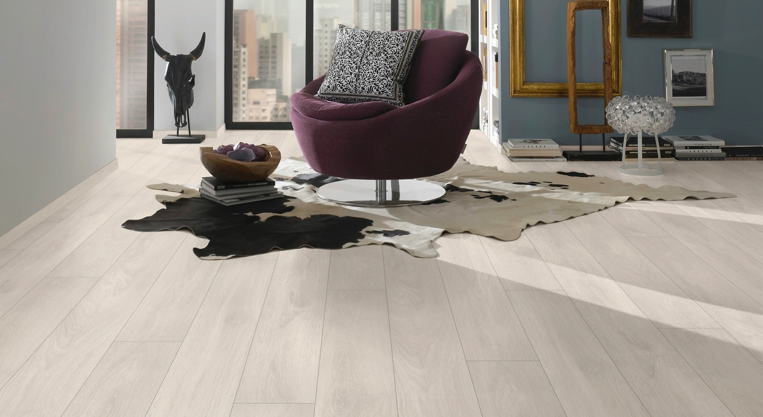 Элегантный светлый оттенок ламината в сочетании с тщательно прорисованным древесным узором делают пространство шире и наполняют его светом и воздухом. Подобный дизайн актуален в современных стилях лофт, гранж, минимализм. Не менее эффектно будет смотреться покрытие в сочетании с элементами декора стилей готика или техно.
