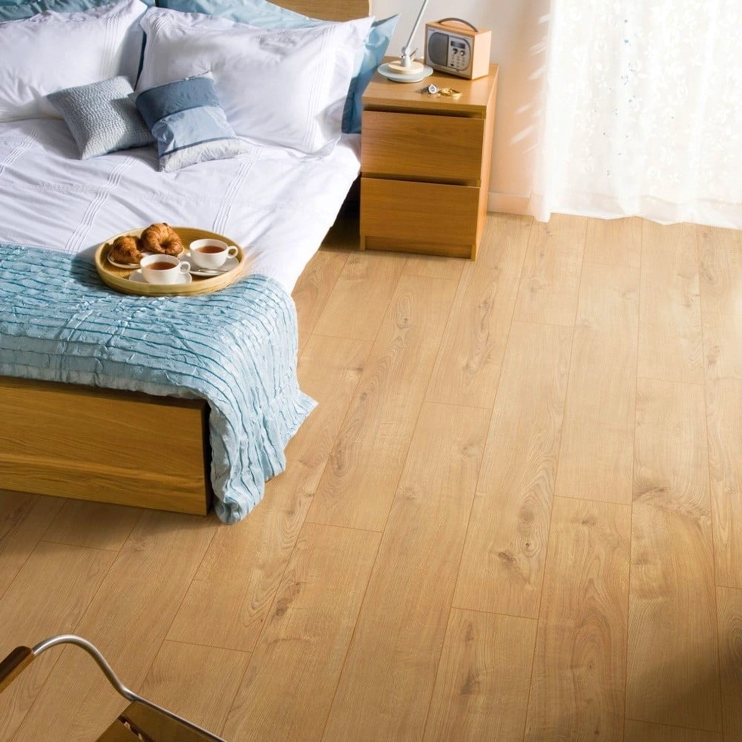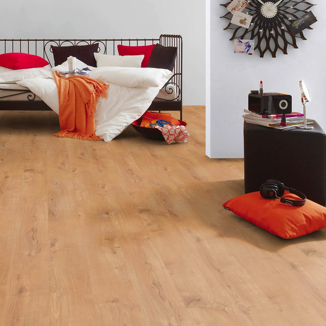 Теплый золотистый оттенок и выраженная древесная фактура - классический дизайн напольных покрытий. Ламинат, неотличимый на вид от натурального дубового паркета, подходит для оформления комнаты в стилях прованс, кантри, шале, природный, скандинавский, минимализм.