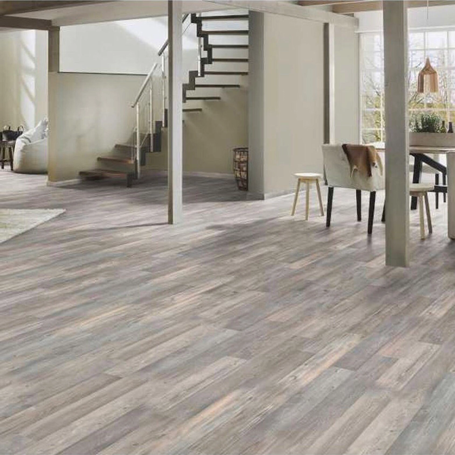 - Панели с легким налетом старины создают эффект потертого деревянного пола. Такой ламинат особенно хорошо смотрится в интерьерах, оформленных в стиле винтаж, кантри или лофт. Спокойная цветовая гамма покрытия прекрасно гармонирует с простой лаконичной мебелью в светлых и темных тонах.