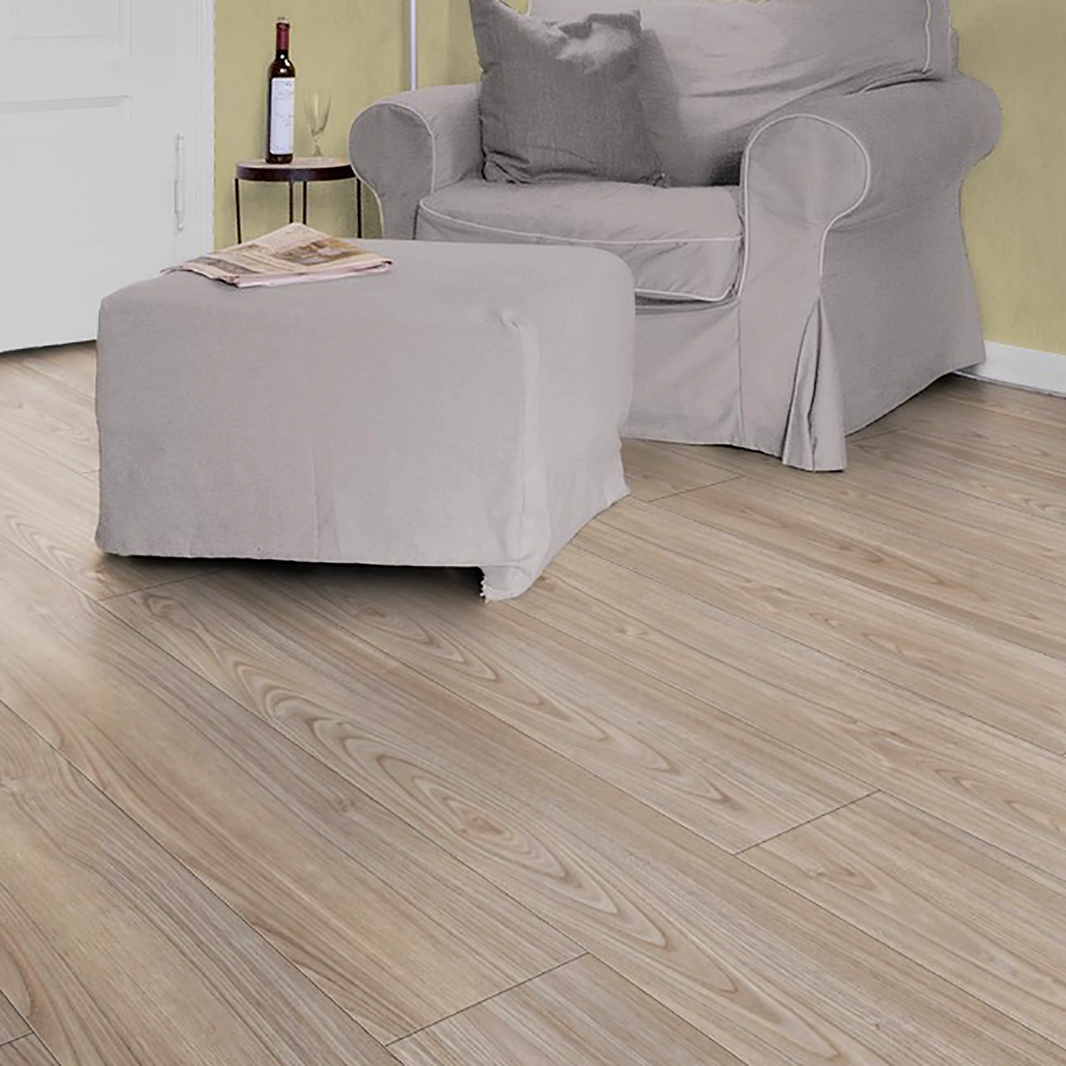 Поверхность напольного покрытия реалистично воспроизводит цвет и фактуру натуральной древесины каштана. Однополосные планки с фаской внешне схожи с натуральной паркетной доской. Светлый ламинат гармонично вписывается в современный интерьер, в котором преобладают природные цвета.