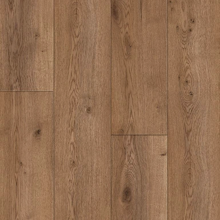 Декор реалистично передает природную текстуру древесины дуба. Однополосный дизайн и крашеная фаска увеличивают сходство ламината с натуральной доской. Напольное покрытие в благородной коричневой гамме делает помещение изысканным и уютным, подходит для классических и современных интерьерных стилей.