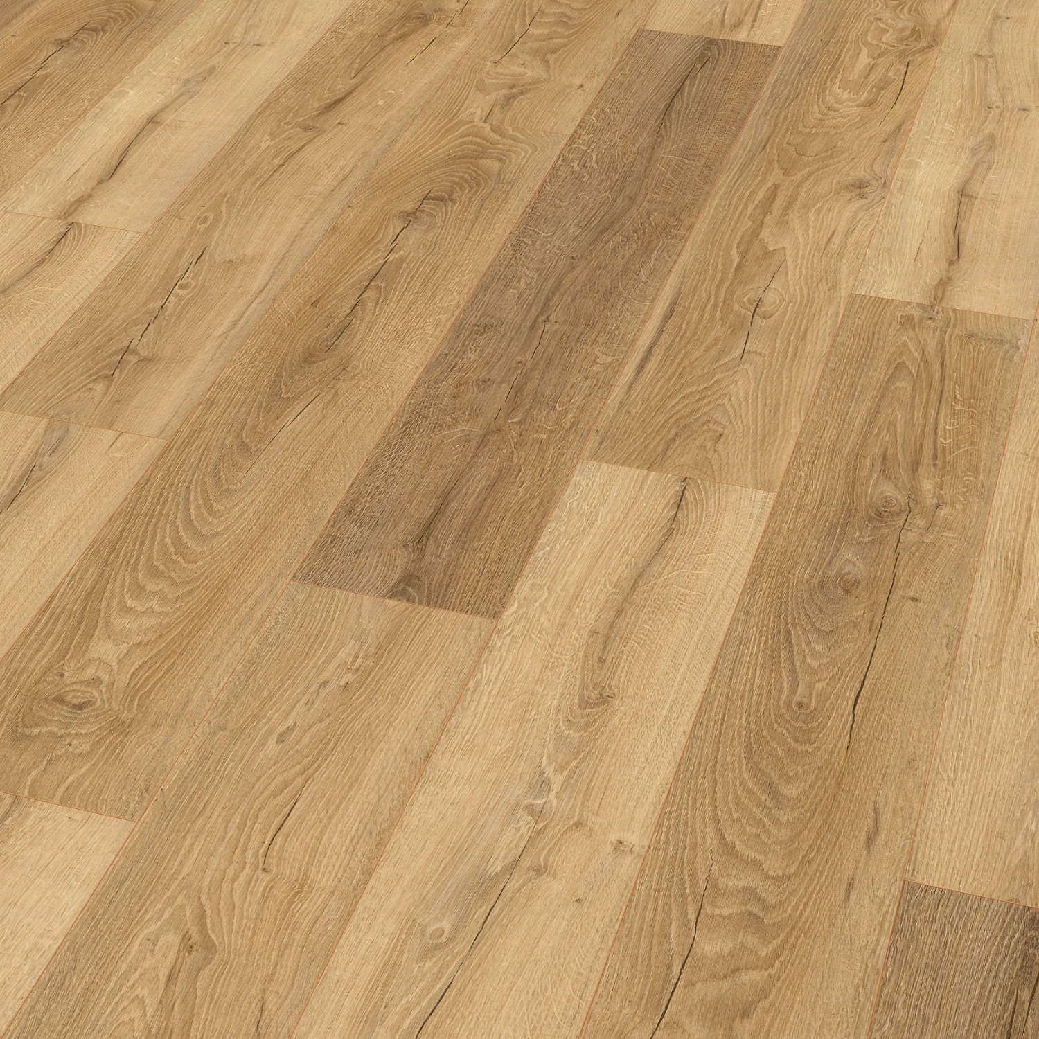 Четко прорисованный узор древесных колец с цветовыми акцентами в виде сучков и трещин делает репродукцию дуба максимально реалистичной. За счет стандартного размера половиц ламинат сложно отличить от натурального дощатого пола.