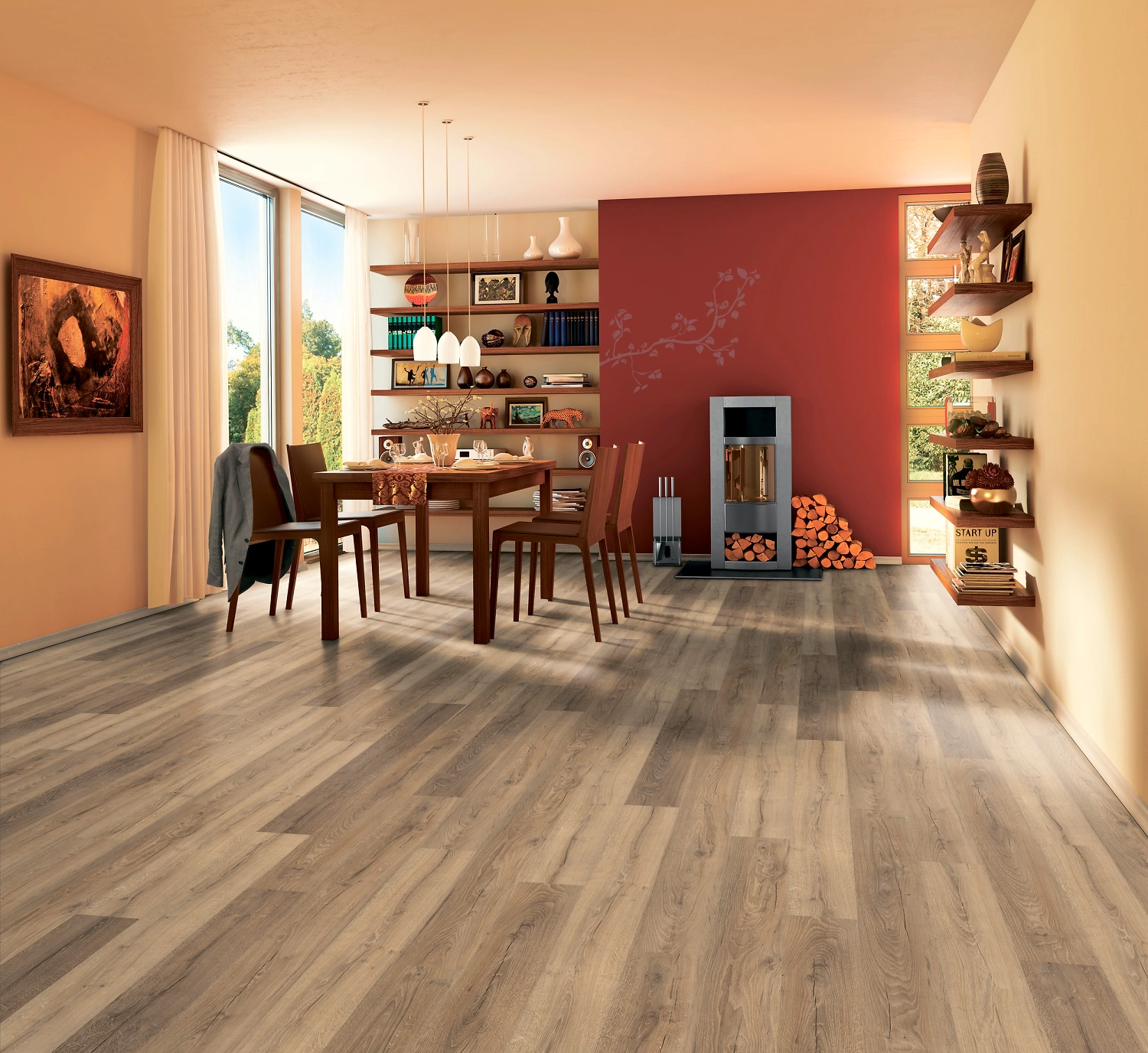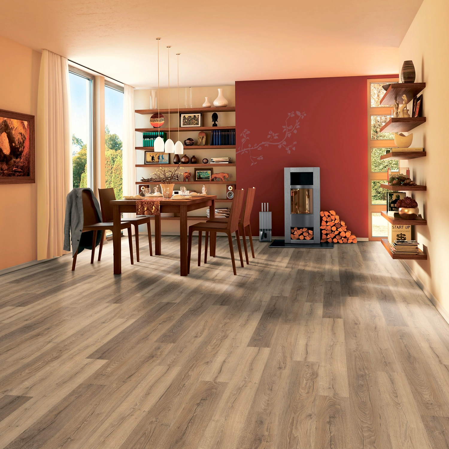 Ламинат Laminate Fussboden Дуб Крутон темный 33 класса с половицами толщиной 10 мм характеризуется высокой устойчивостью к внешним воздействиям и нагрузкам,