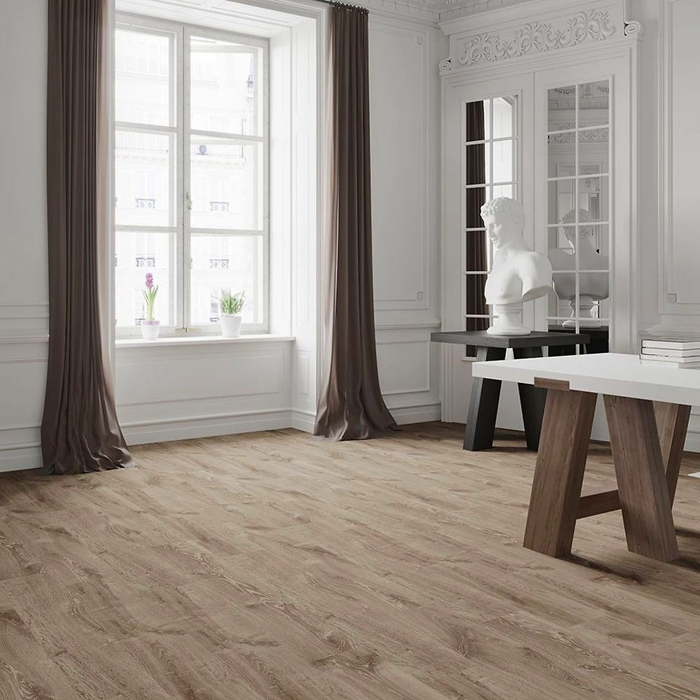 Ламинат светло коричневого оттенка с матовой поверхностью и фаской по периметру практически неотличим от натуральной доски дуба. Классический оттенок дуба создает ощущение правильности форм и природной гармонии. Декор отлично вписывается в дизайн в стиле классика, лофт, природный или прованс, позволяет при желании обновить интерьер без замены напольного покрытия.